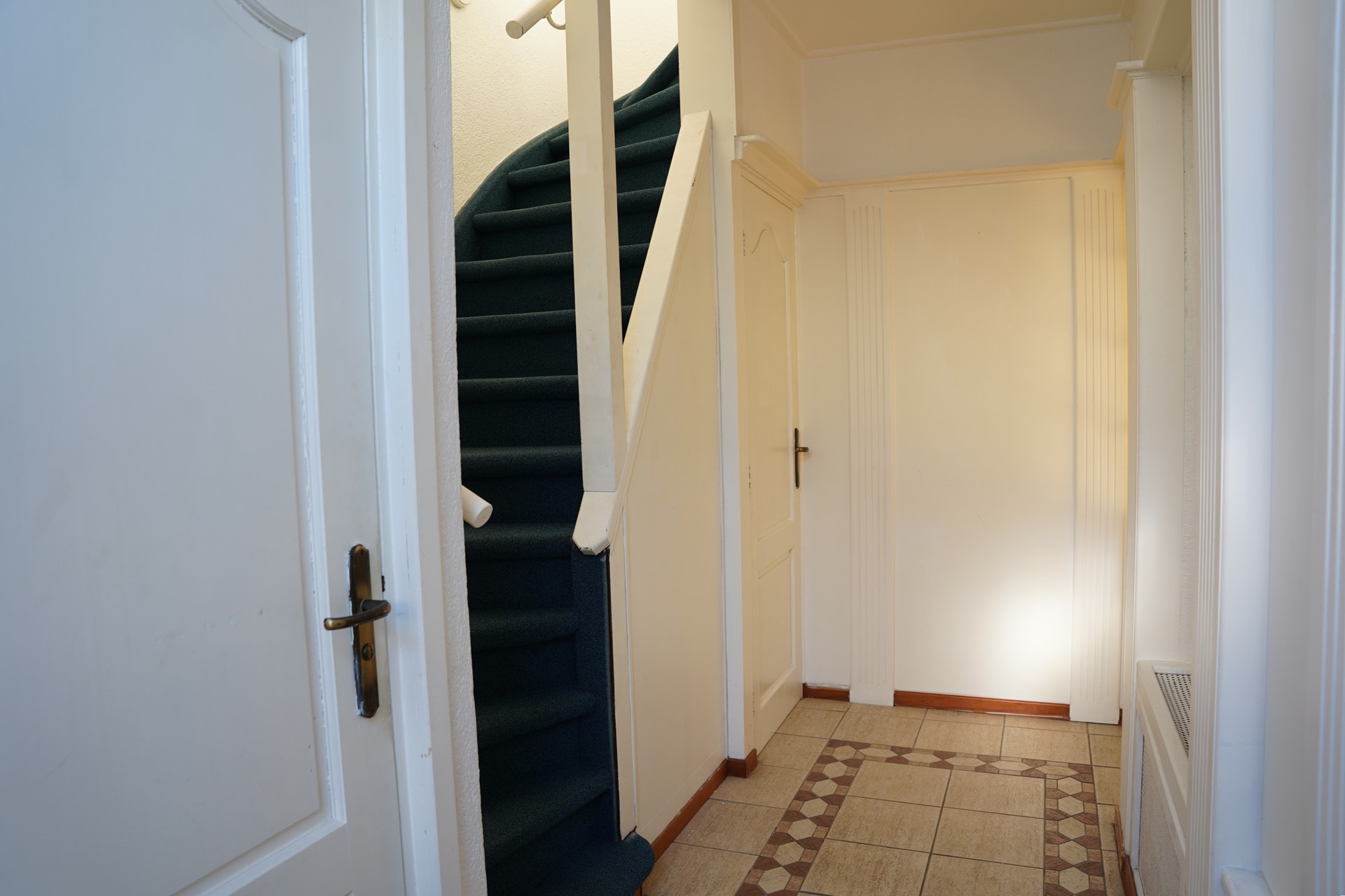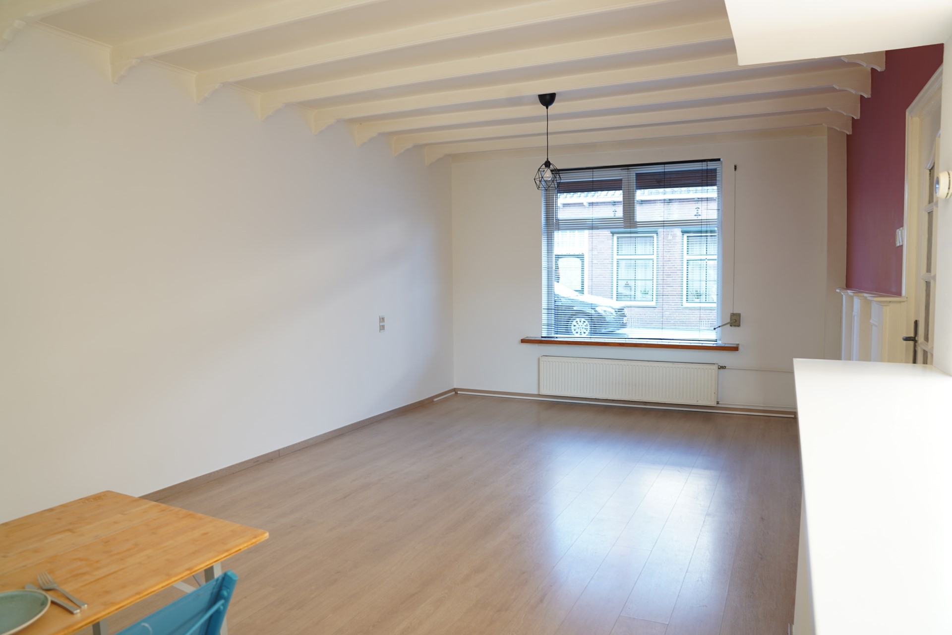 Hal met toilet, meterkast, kelderkast en opgaande trap. Royale woonkamer met laminaatvloer. Ruime open keuken voorzien van apparatuur.