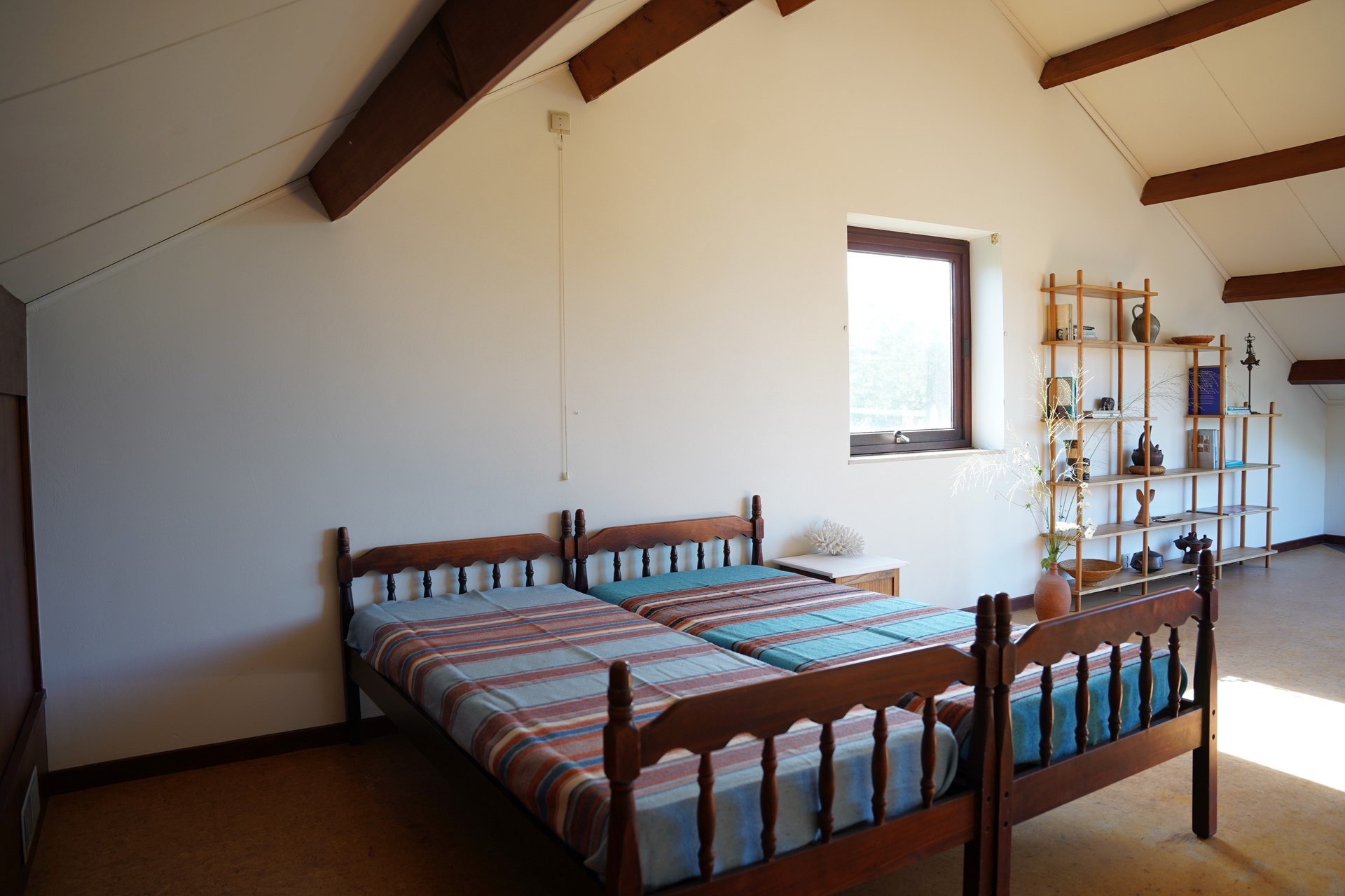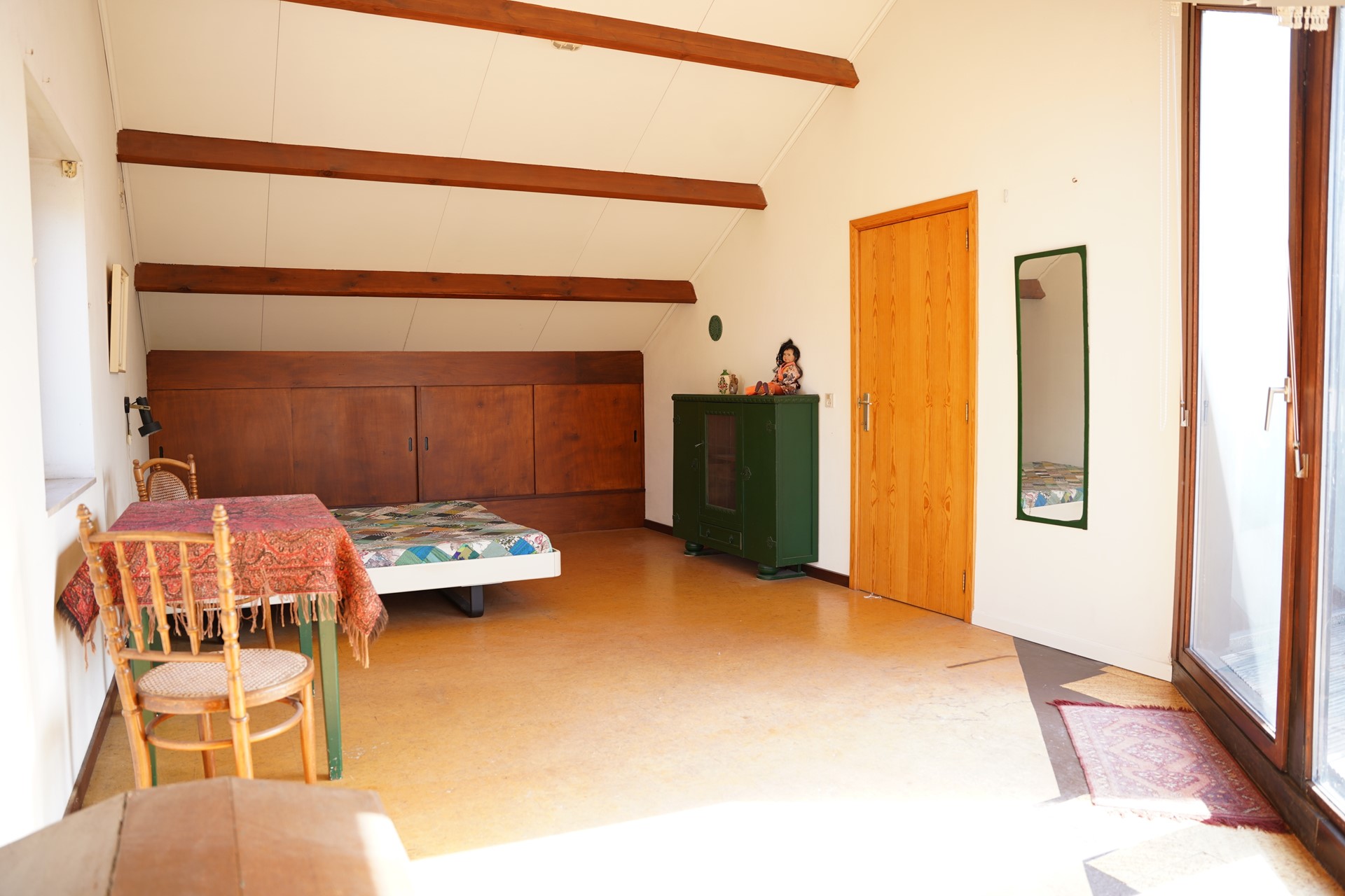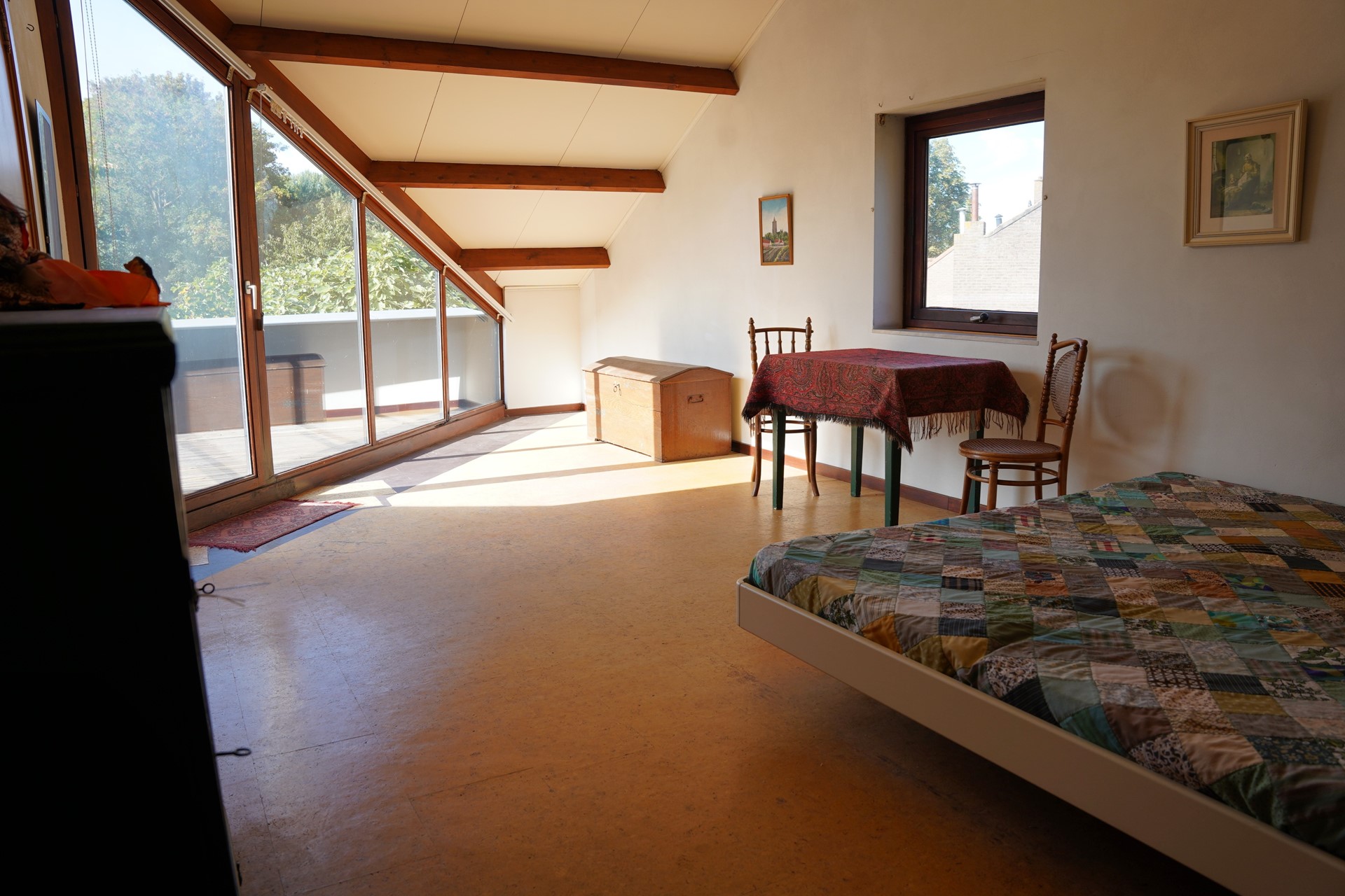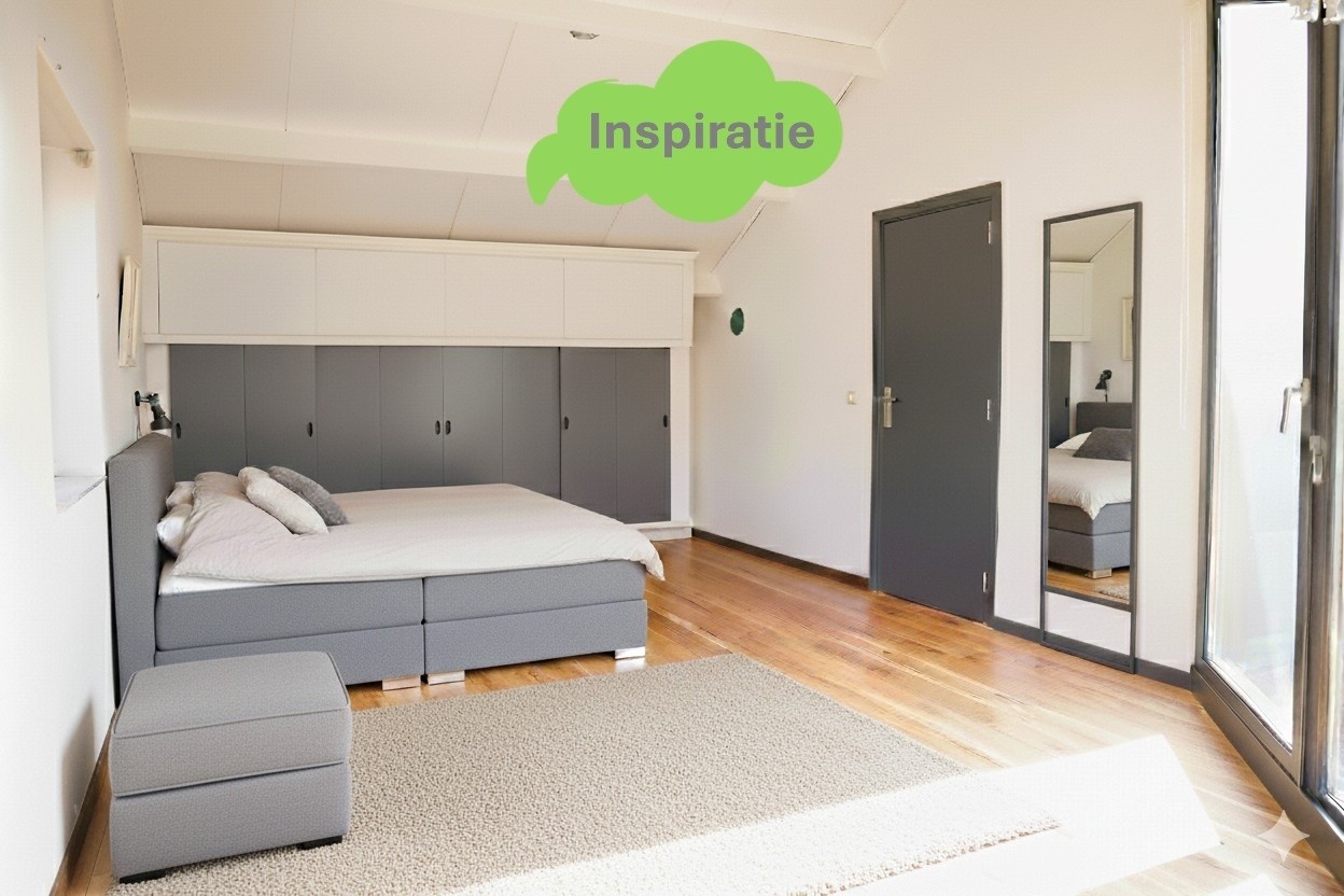 Op de verdieping vind je twee ruime slaapkamers, beide met veel lichtinval door de mooi geplaatste glazen wanden. Vanuit beide slaapkamers stap je zo het dakterras op — een fijne plek om te genieten van de zon en het uitzicht. Op deze verdieping vind je de tweede badkamer met douche, wastafel en 3e toilet, voorzien van een Velux dakraam.