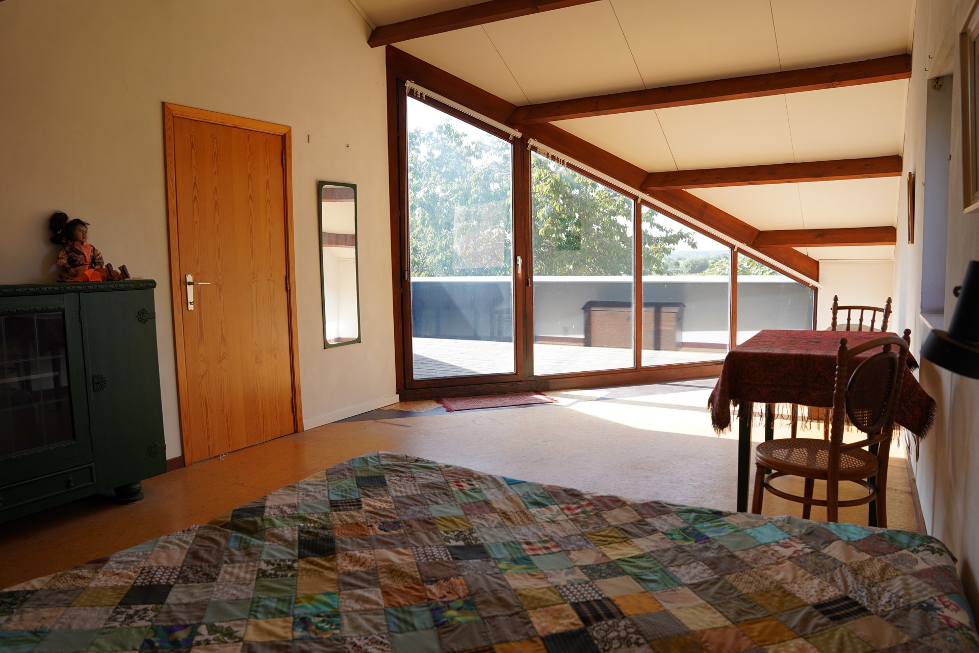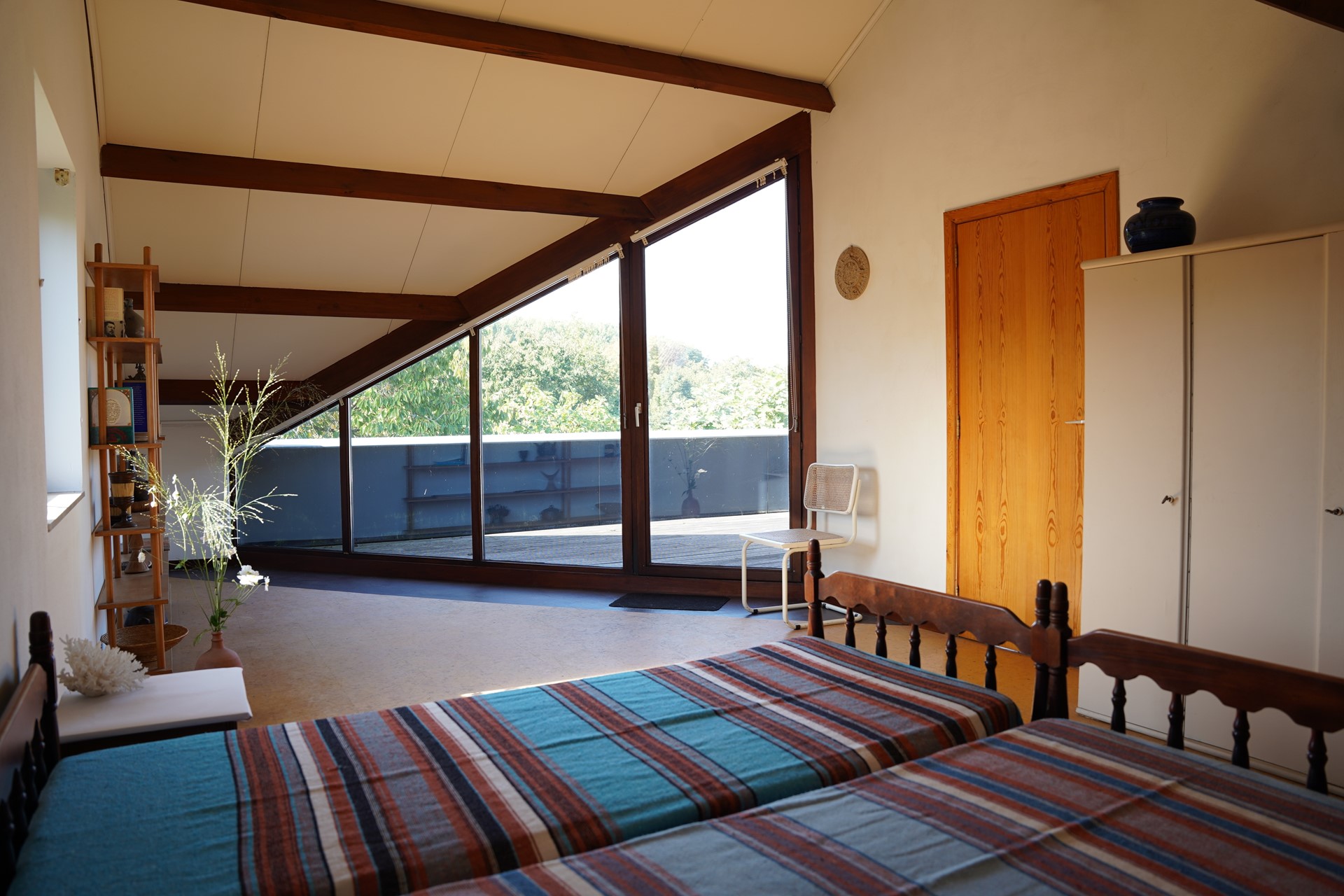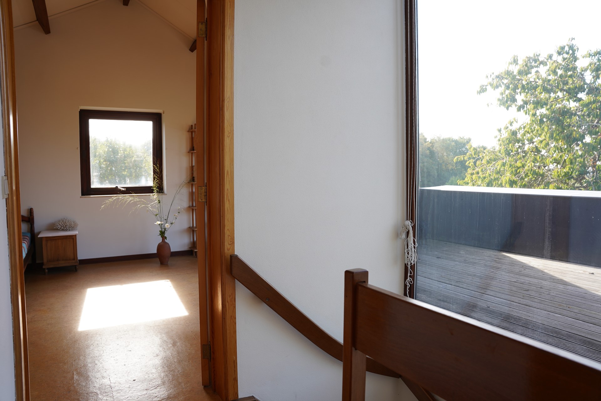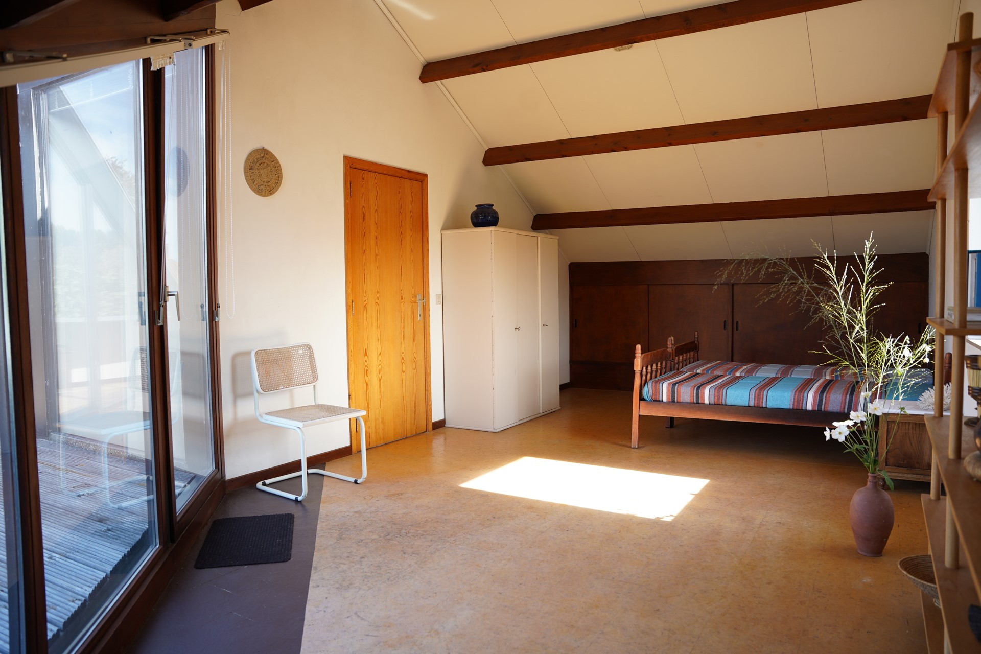Op de verdieping vind je twee ruime slaapkamers, beide met veel lichtinval door de mooi geplaatste glazen wanden. Vanuit beide slaapkamers stap je zo het dakterras op — een fijne plek om te genieten van de zon en het uitzicht. Op deze verdieping vind je de tweede badkamer met douche, wastafel en 3e toilet, voorzien van een Velux dakraam.