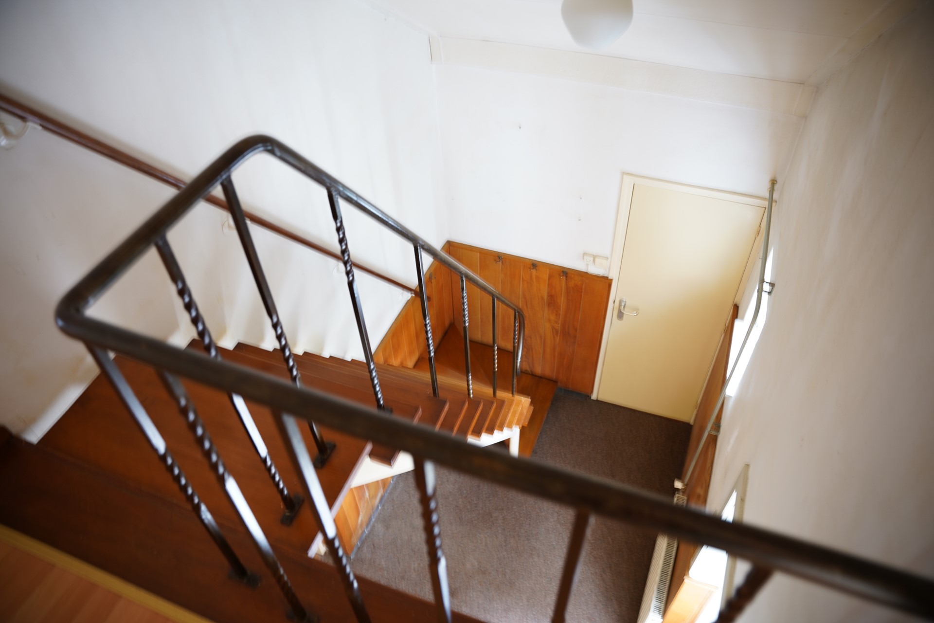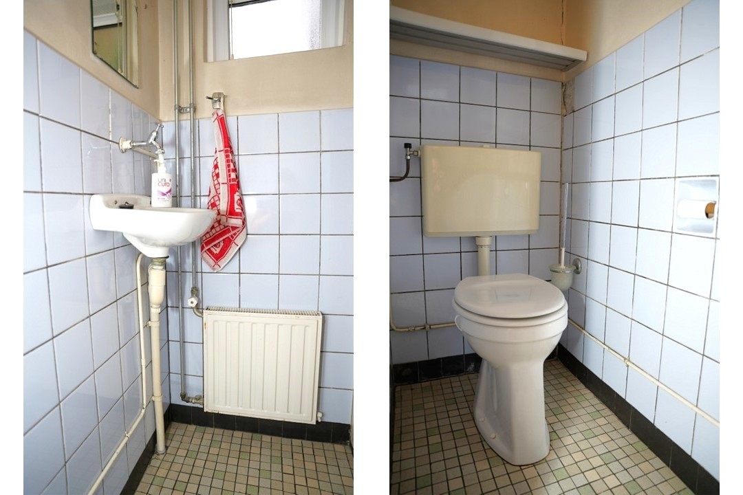 Naast de keuken bevindt zich een achterhal met het toilet en de trapopgang naar de verdieping.