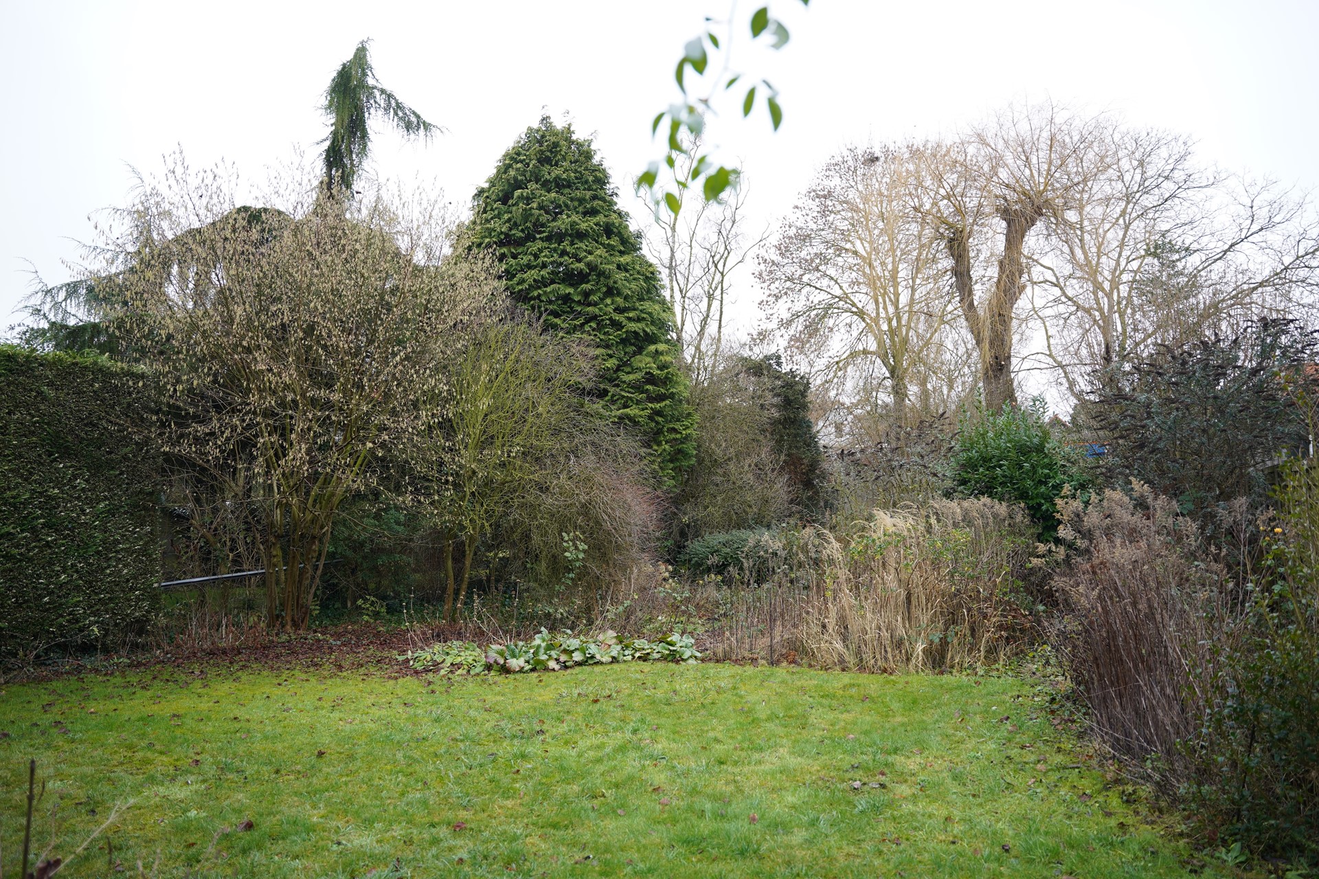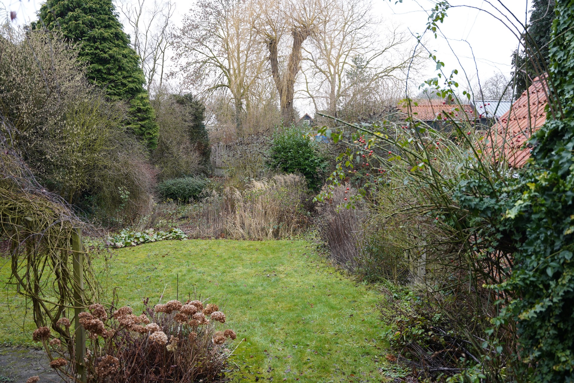 De beschermde treurwilg in de tuin is werkelijk een pronkstuk, die zorgt voor een bijzondere sfeer.