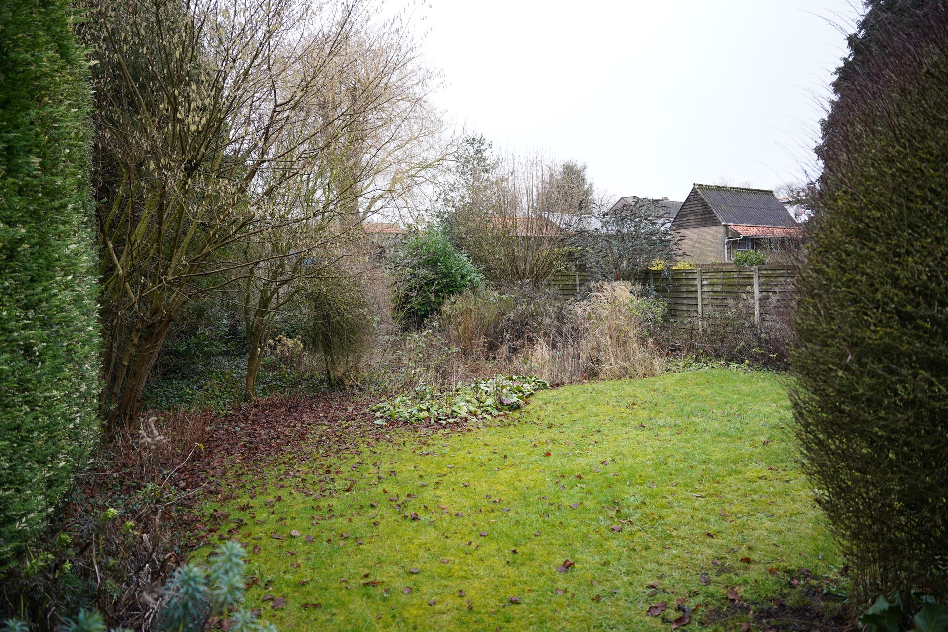 De achtertuin is een echte verrassing. Deze is verdiept aangelegd, volledig omheind en rijk aan groen. Door de ligging op het zuidwesten geniet je hier van veel zon, terwijl het groen zorgt voor een fijne, beschutte sfeer.