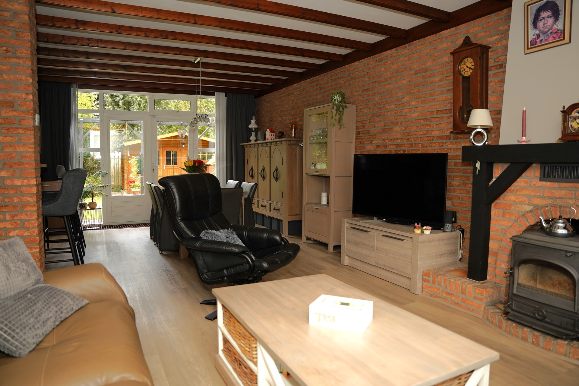Je komt binnen in de nette, ruime hal met meterkast, toilet en de trap naar de 1e etage. De royale slaapkamer op de begane grond is voorzien van airconditioning en heeft toegang naar een eigen privé badkamer met bad-douche combinatie, een wastafelmeubel, handdoekradiator en een infrarood paneel. Elektrische verwarming zorgt voor aangename (bij)verwarming. De woonkamer en de keuken zijn voorzien van een moderne pvc vloer, een gezellige houtkachel en openslaande tuindeuren naar het terras. De balken in het plafond zijn decoratief en geven extra karakter aan de ruimte. De open keuken is voorzien van alle benodigde apparatuur, inclusief heet water kraan. Het aanrecht blad in de inbouwapparatuur zijn vernieuwd in 2023. Aansluitend vind je de praktische bijkeuken met aansluitingen voor de wasmachine en de droger.