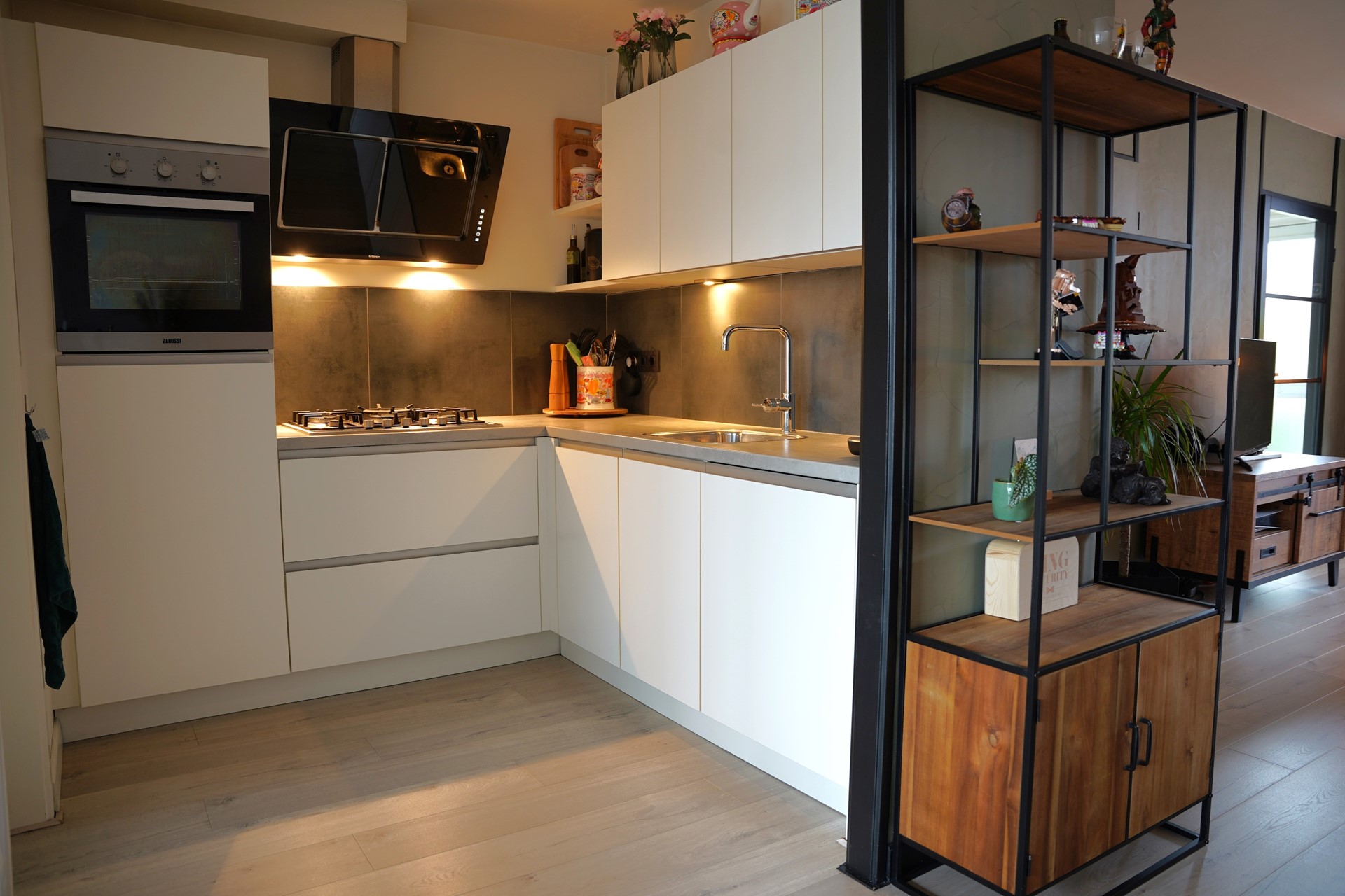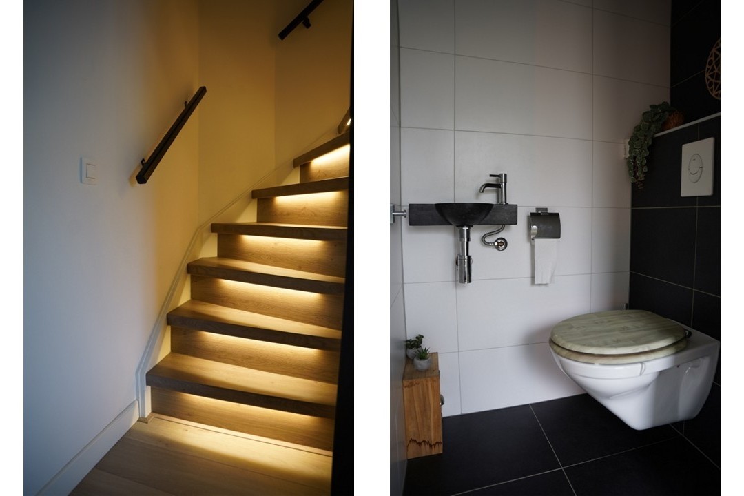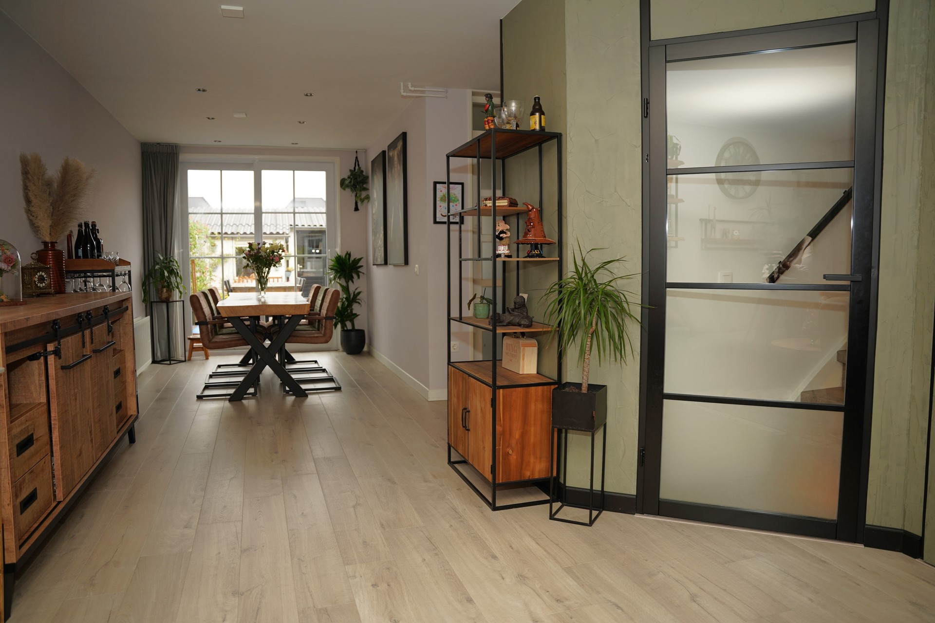 Je komt binnen in de hal met een modern hangtoilet en stijlvolle zwarte deuren met glas, die direct zorgen voor een eigentijdse uitstraling. De ruime woonkamer is aan de achterzijde uitgebouwd, voorzien van een fraaie laminaatvloer, trapkast en een grote schuifpui naar de tuin – ideaal om in de zomer binnen en buiten met elkaar te verbinden. De open keuken (vernieuwd in 2017) is uitgerust met diverse inbouwapparatuur en biedt voldoende werk- en bergruimte. Aansluitend bevindt zich de bijkeuken, met aansluitingen voor wasmachine en droger, praktische kastruimte en een extra doorgang naar buiten.