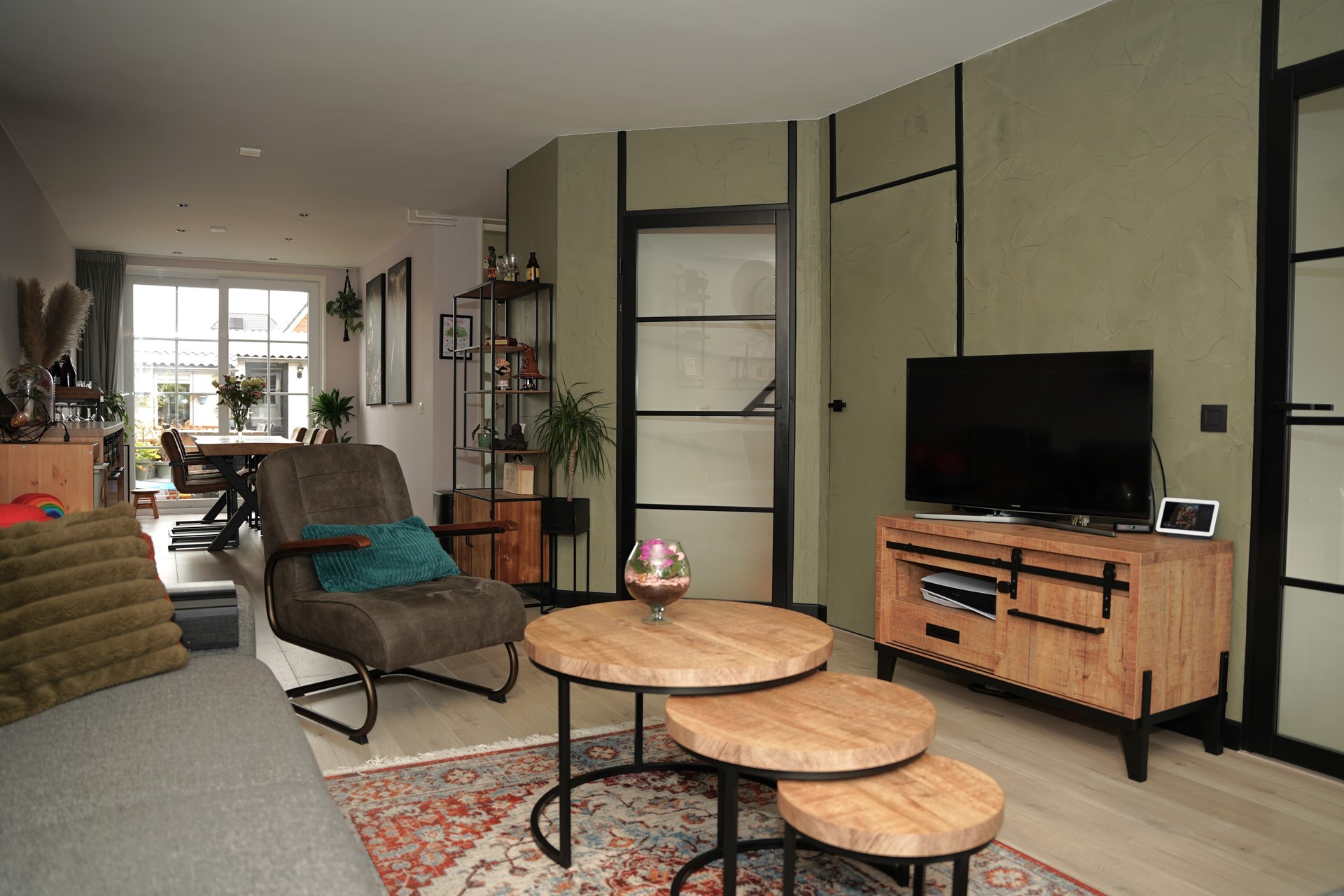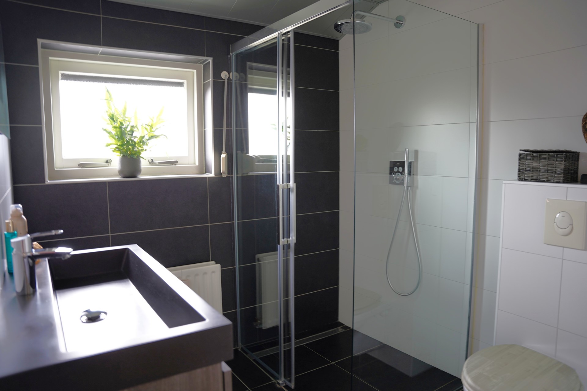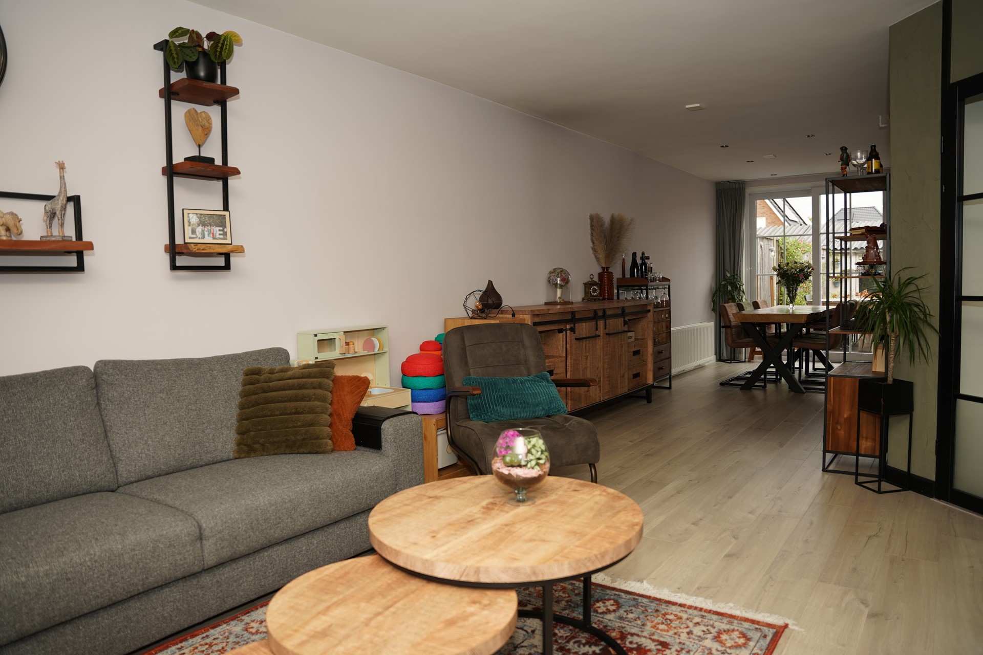 Je komt binnen in de hal met een modern hangtoilet en stijlvolle zwarte deuren met glas, die direct zorgen voor een eigentijdse uitstraling. De ruime woonkamer is aan de achterzijde uitgebouwd, voorzien van een fraaie laminaatvloer, trapkast en een grote schuifpui naar de tuin – ideaal om in de zomer binnen en buiten met elkaar te verbinden. De open keuken (vernieuwd in 2017) is uitgerust met diverse inbouwapparatuur en biedt voldoende werk- en bergruimte. Aansluitend bevindt zich de bijkeuken, met aansluitingen voor wasmachine en droger, praktische kastruimte en een extra doorgang naar buiten.