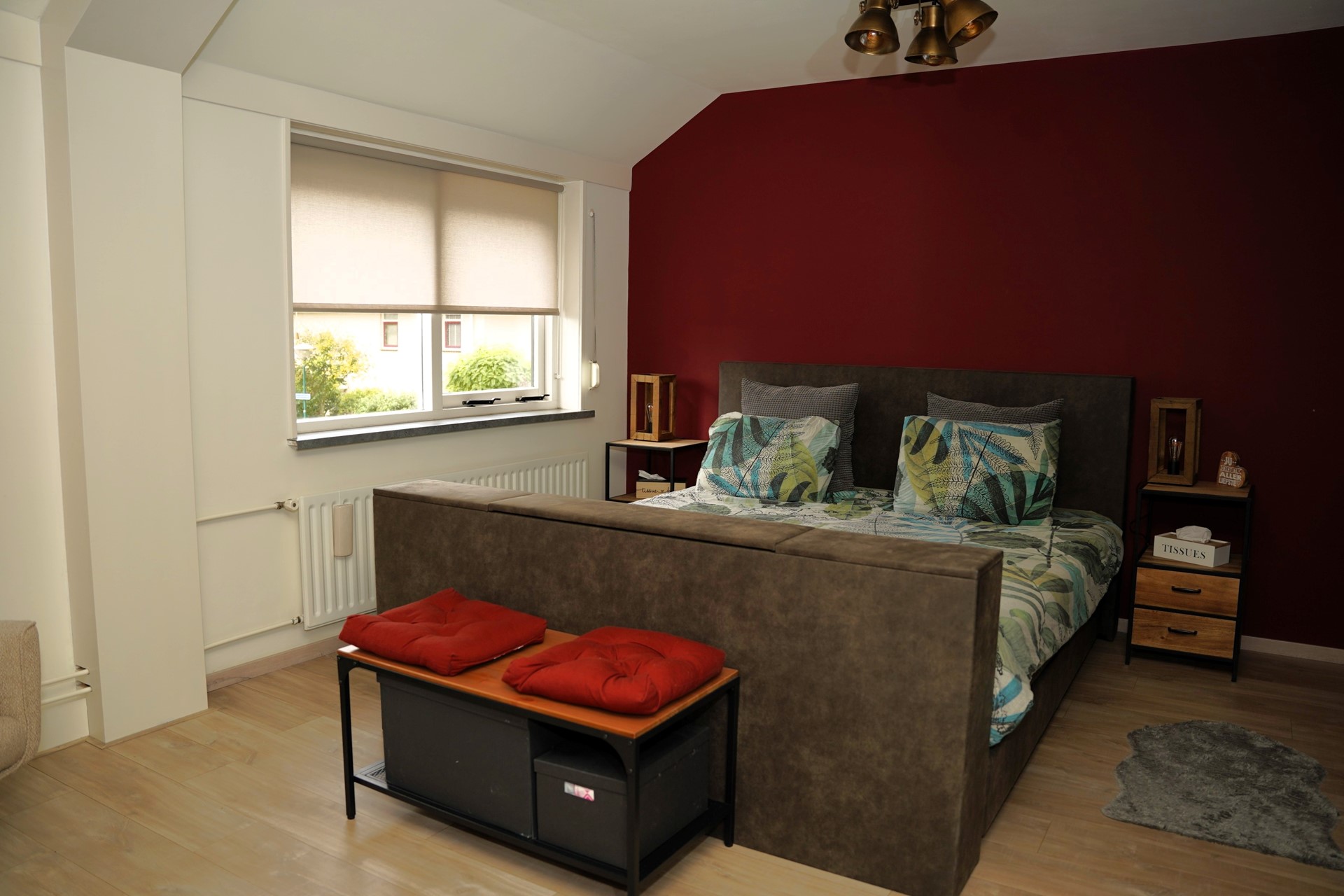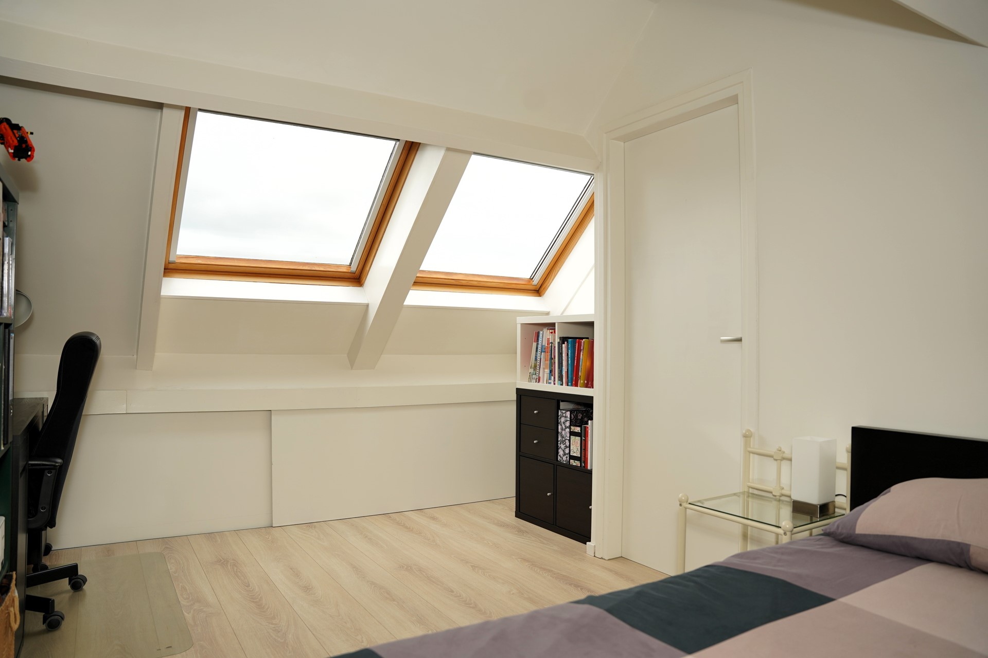 De tweede verdieping is keurig afgewerkt met een laminaatvloer. Op de overloop bevindt zich een praktische bergruimte met de cv-ketel en de omvormer voor de zonnepanelen. Daarnaast is er een derde, sfeervolle slaapkamer met twee Velux-dakramen – een fijne plek om te slapen, werken of studeren.