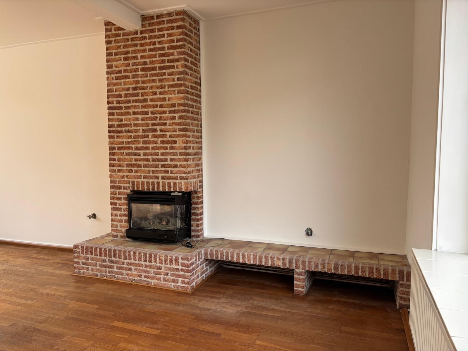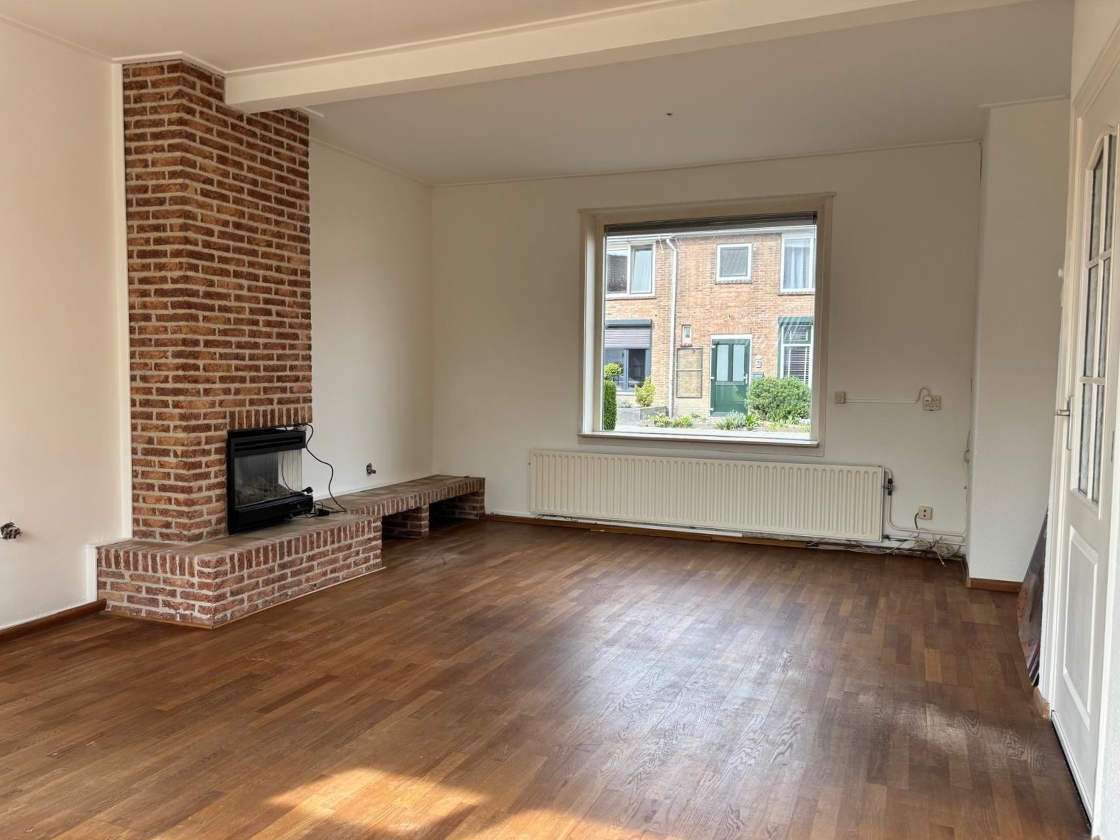 De woonkamer is licht en ruim van opzet, met een houten vloer en een sfeervolle schouw. Een fijne plek waar je gemakkelijk een gezellige leefruimte creëert.