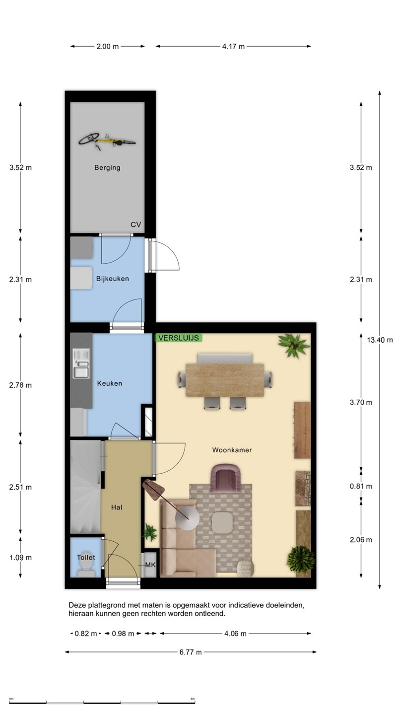 De hal met opgaande trap, vormt de centrale entree. Hier vind je het toilet, een trapkast en de meterkast. Vanuit hier bereik je de woonkamer en de keuken.