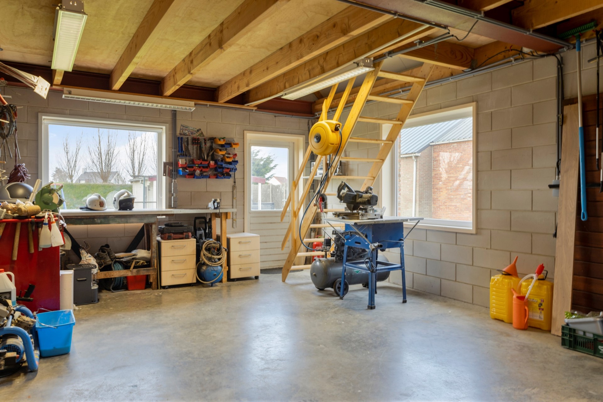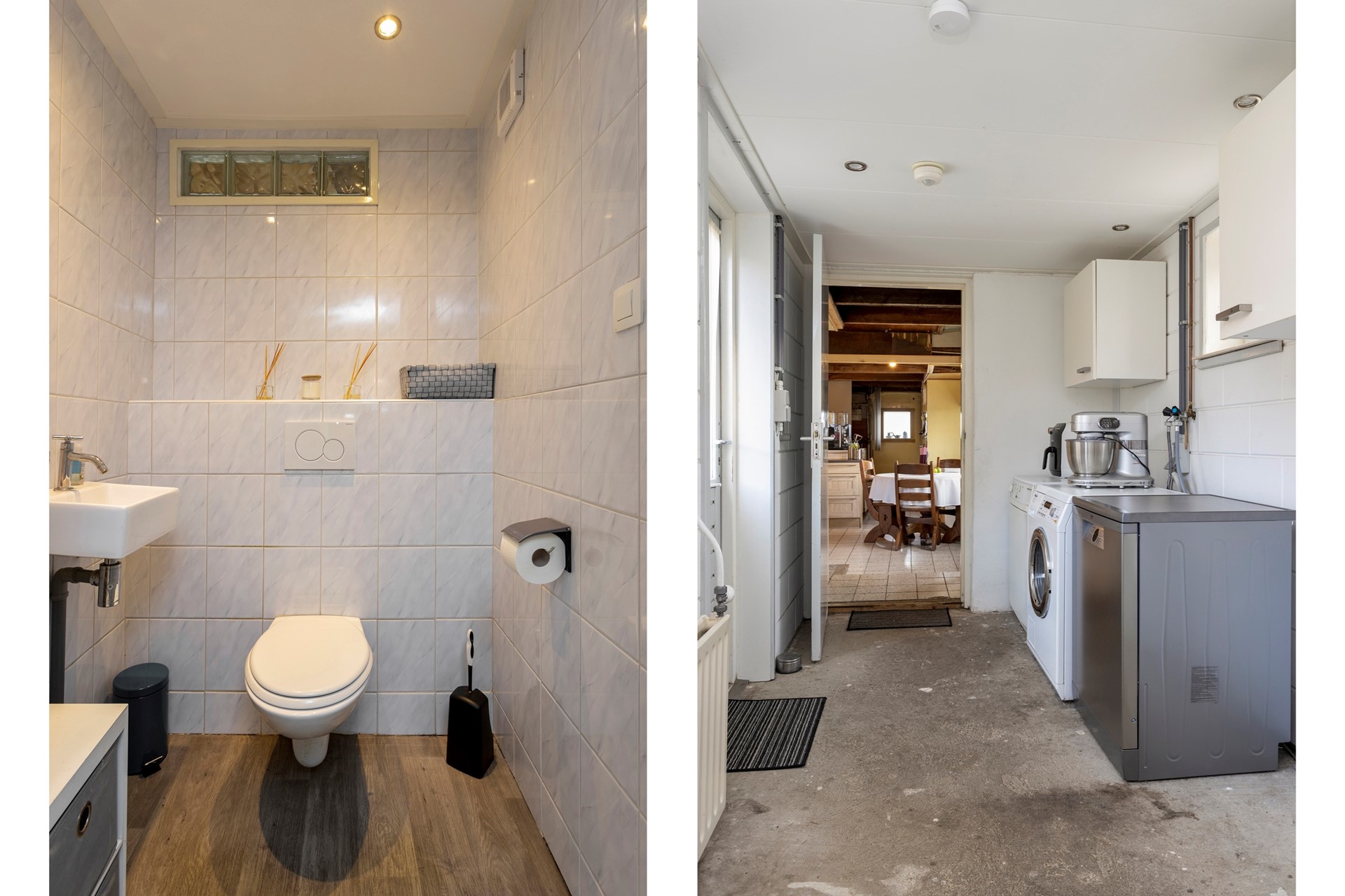 Aanbouw; De aanbouw stamt uit 2008 en is volledig geïsoleerd, wat zorgt voor een hedendaags comfort. Binnenin vind je een praktische bijkeuken met aansluitingen voor de wasmachine en droger, en een modern hangtoilet met fonteintje. De inpandige royale garage is voorzien van elektrische deuren, waarbij het achterste gedeelte van de ruimte extra breed is. Een vaste trap leidt naar de zolder, een ruime en veelzijdige ruimte met talloze mogelijkheden. Hier kun je zelfs een hobbyruimte of kantoor creëren, dankzij de comfortabele nokhoogte van ongeveer 2,5 meter. Voor de garage ligt een lange oprit waar minimaal twee auto's kunnen worden geparkeerd.