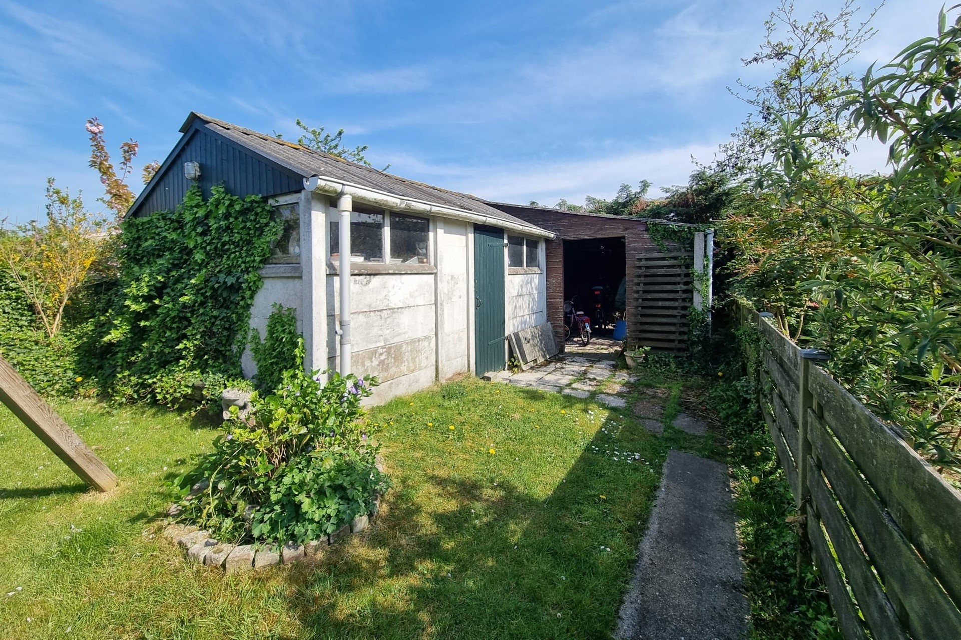 De diepe tuin is gelegen op het Zuiden en grenst aan een akkerland. Het zonneterras nodigt uit tot ontspanning te midden van je eigen groene oase van rust en privacy. Ook is er voldoende ruimte voor een speeltoestel voor de jonge bewoners. En voor de liefhebbers van tuinieren onder ons; met een grondwaterput en handpomp, gecombineerd met een buitenkraan kun je de tuin gemakkelijk onderhouden. Twee bergingen zorgen voor extra opbergruimte voor fietsen en containers. Via het pad naast het huis met de poort ben je snel aan de voorzijde van het huis.