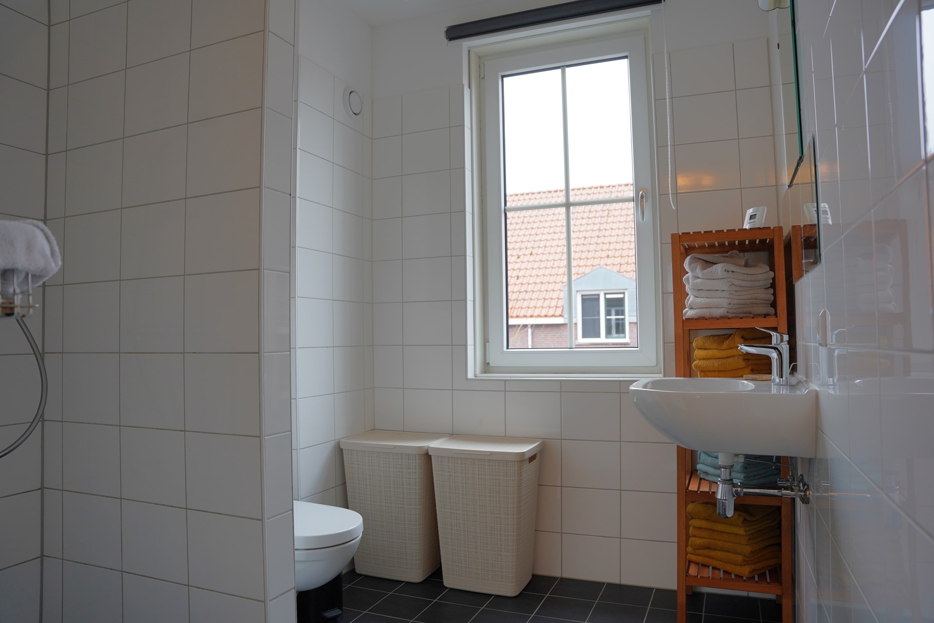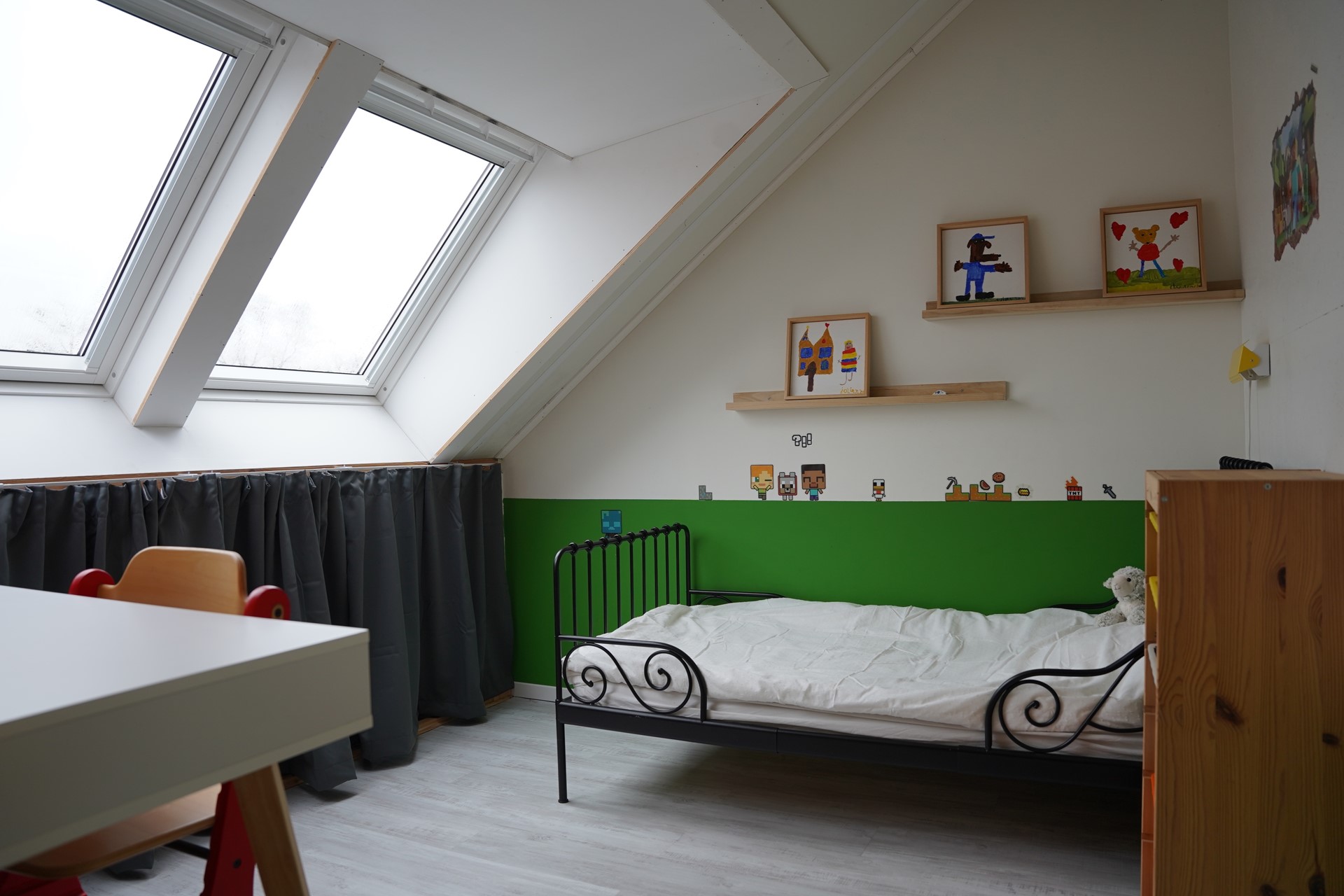 Op de eerste verdieping vind je drie goed bemeten slaapkamers. Dankzij de slimme indeling zijn alle kamers praktisch en volwaardig in gebruik, ideaal voor een gezin of voor werken aan huis. De badkamer is modern en compleet, voorzien van een inloopdouche, wastafelmeubel, toilet en infraroodverwarming. Een comfortabele en frisse ruimte om de dag te beginnen.