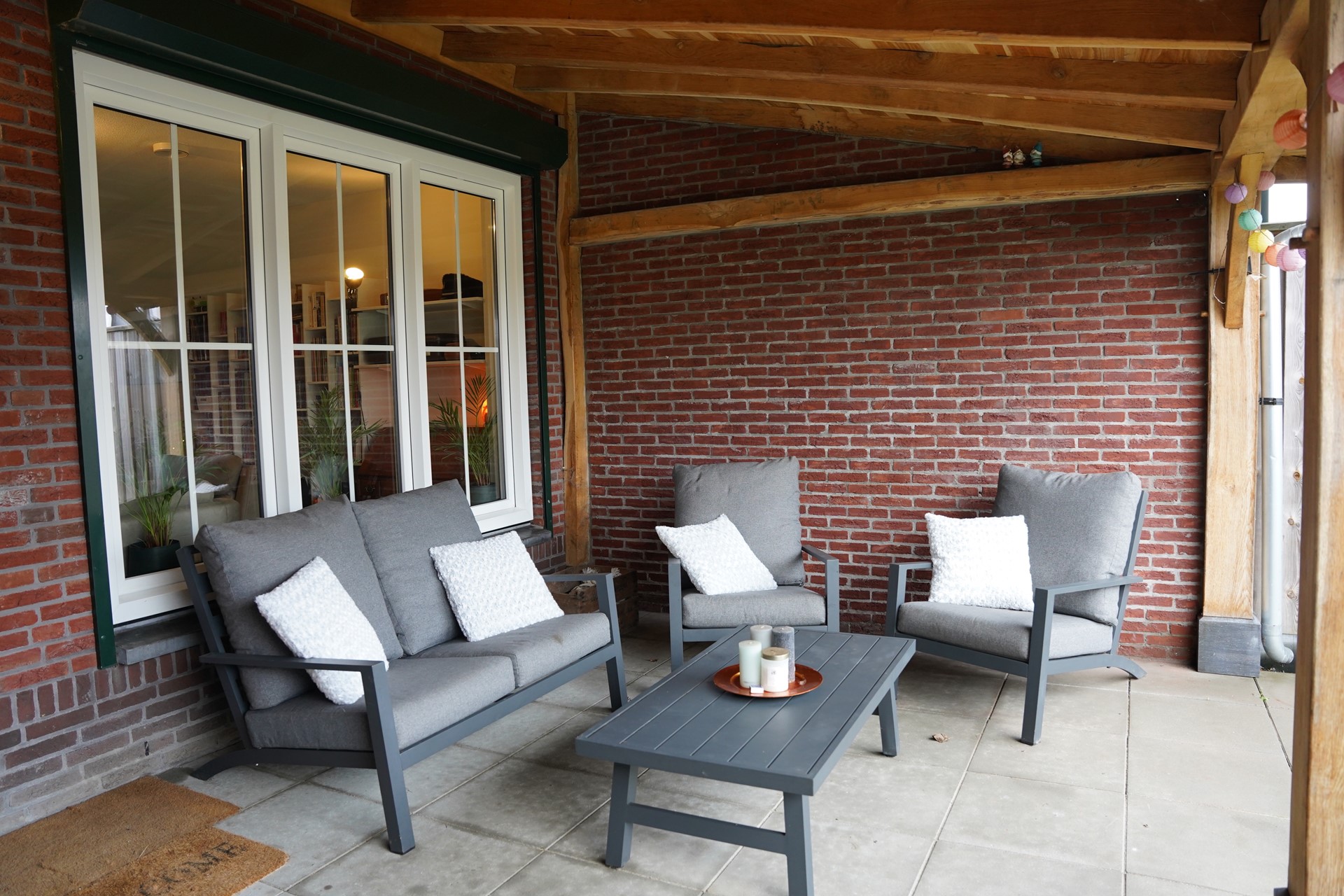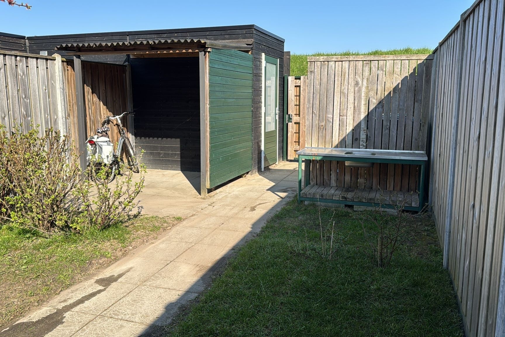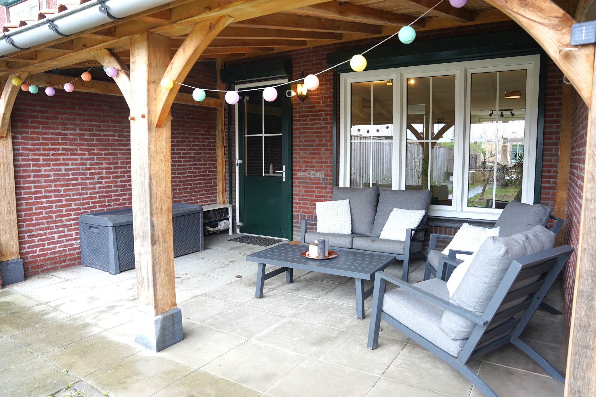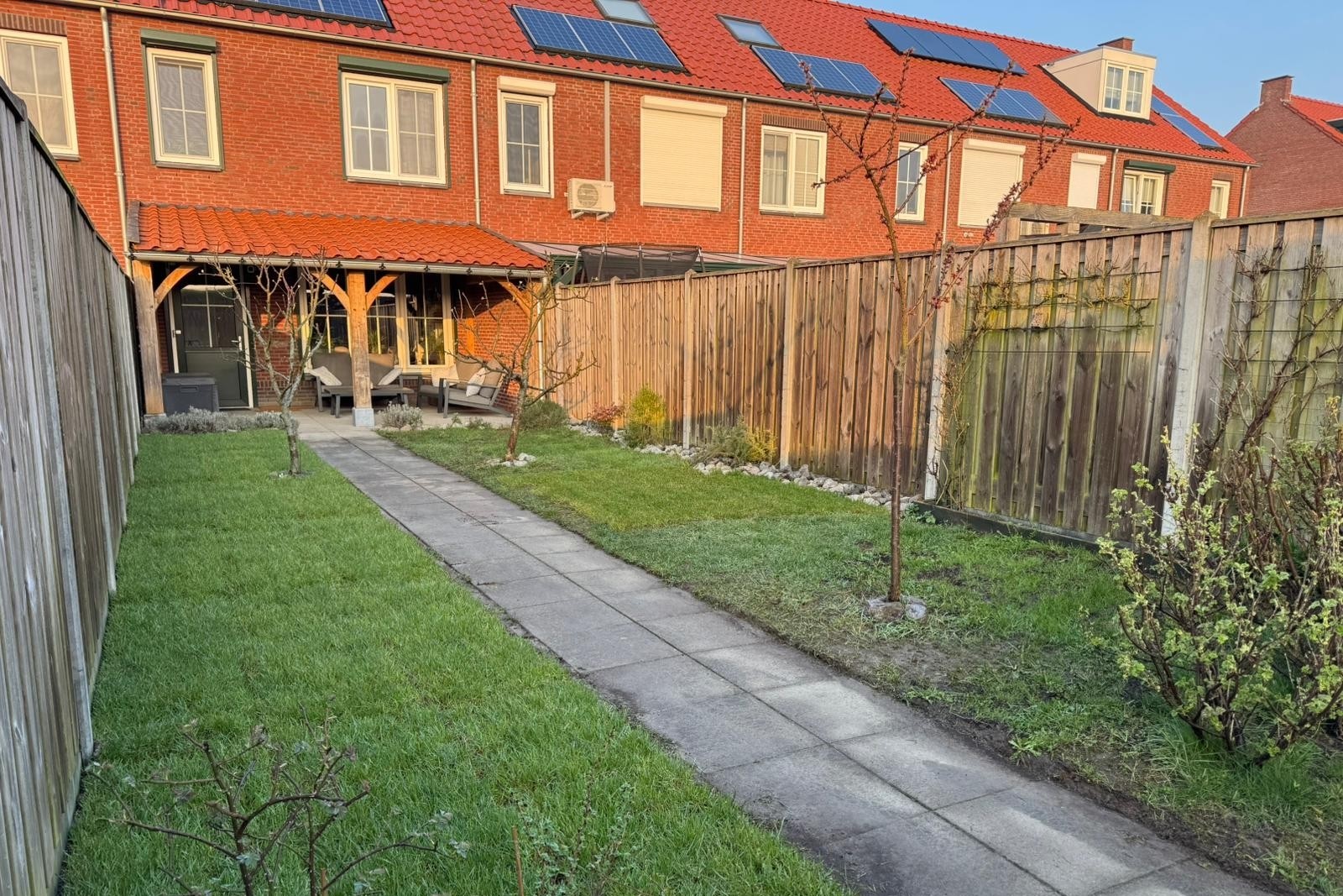 De achtertuin ligt op het oosten en is bereikbaar via een achterom. De tuin is recent aangepakt en daardoor niet alleen mooier, maar ook een stuk onderhoudsvriendelijker geworden. Waar eerder stapstenen lagen, vind je nu een verzorgd grasveld dat rust en ruimte uitstraalt. De absolute eyecatcher is het fraaie, rustieke overdekte terras van Bouweik dat direct aan de woning is gebouwd. Hier zit je het hele jaar door heerlijk beschut buiten. Achterin de tuin staat een houten berging met kapschuur, ideaal voor fietsen, gereedschap en tuinspullen. Alles is netjes afgewerkt en klaar voor gebruik, zodat jij vooral kunt genieten. Tel hierbij op de ligging aan de rand van het dorp met uitzicht op de vestingwallen en de Zeeuws Vlaamse polders en je kunt niet anders dan concluderen: hier wordt het buitenleven nog prettiger.