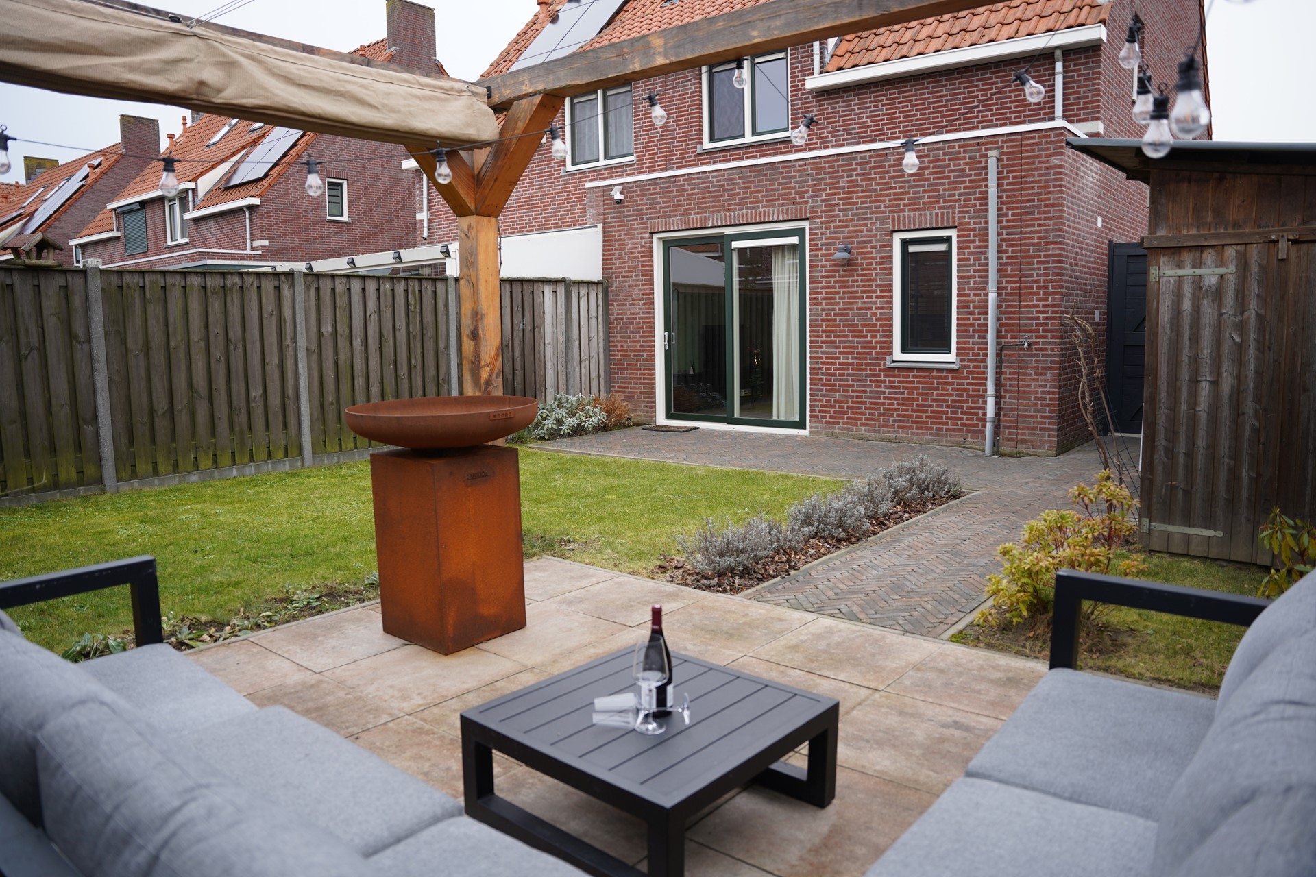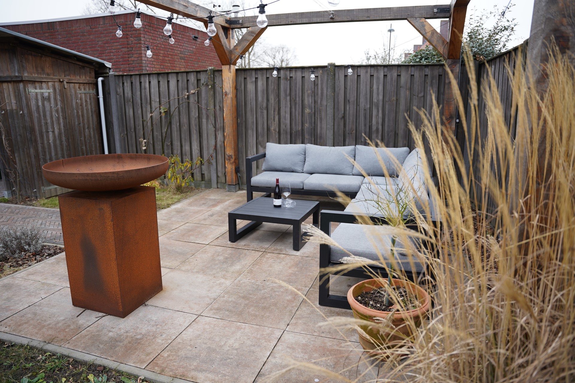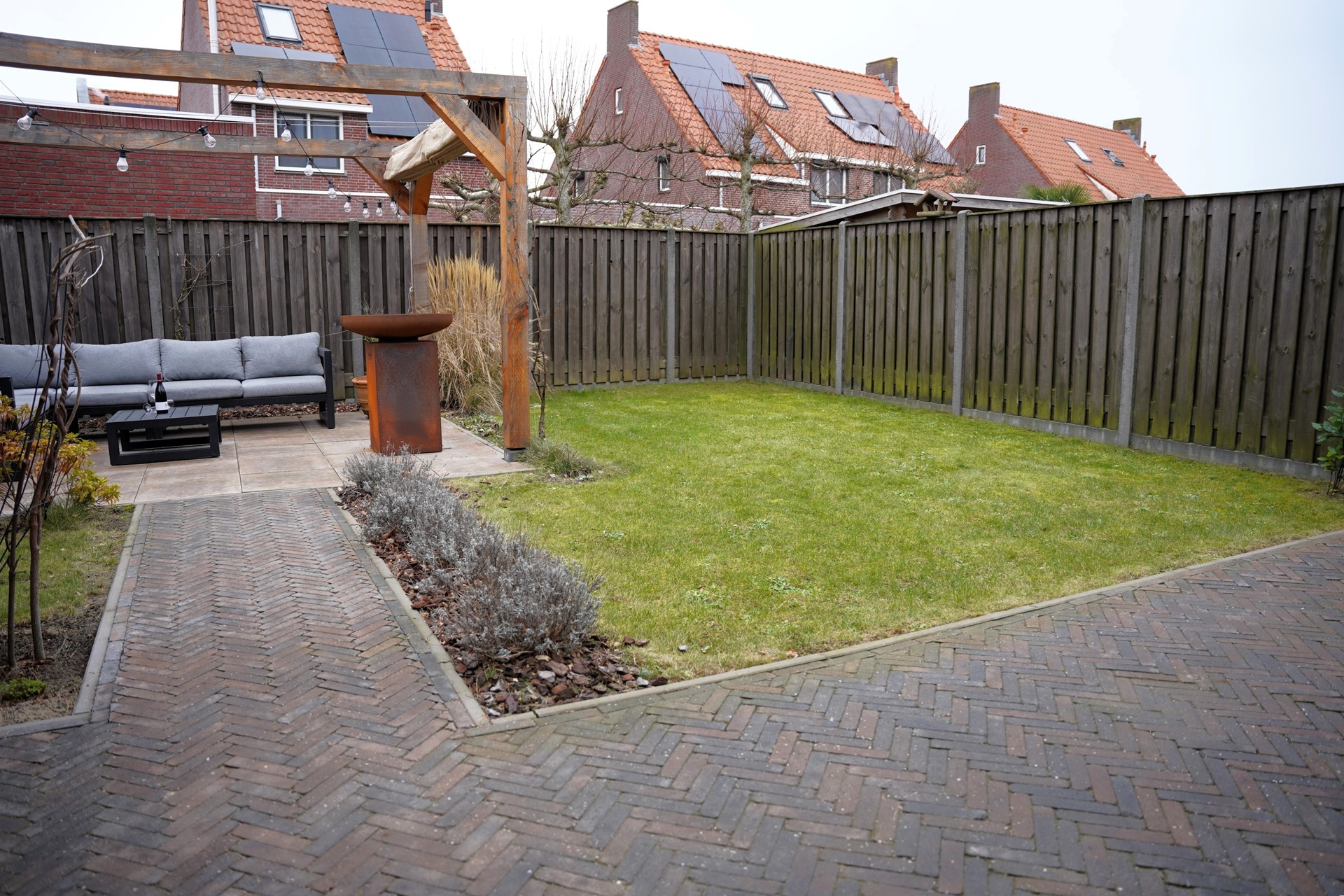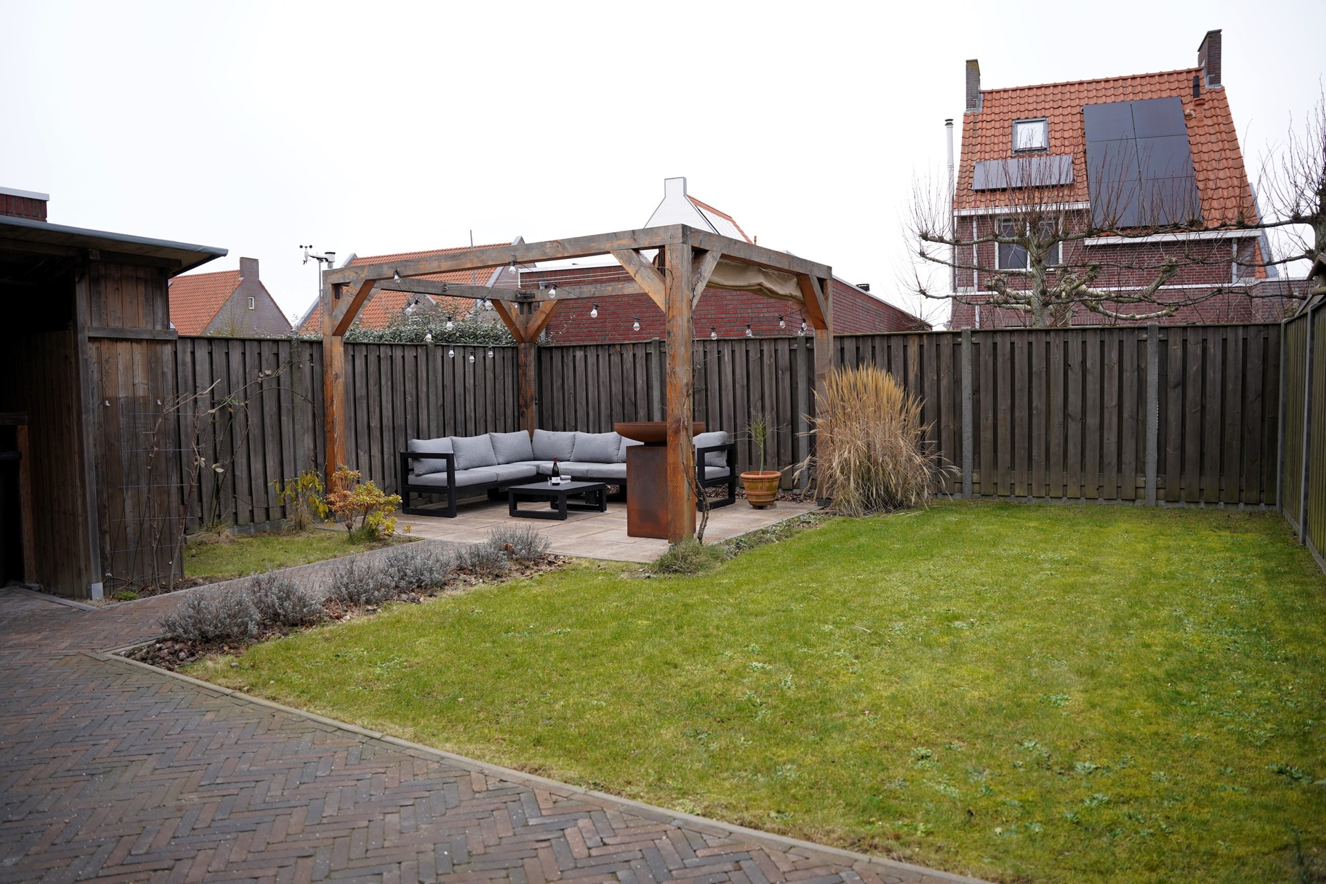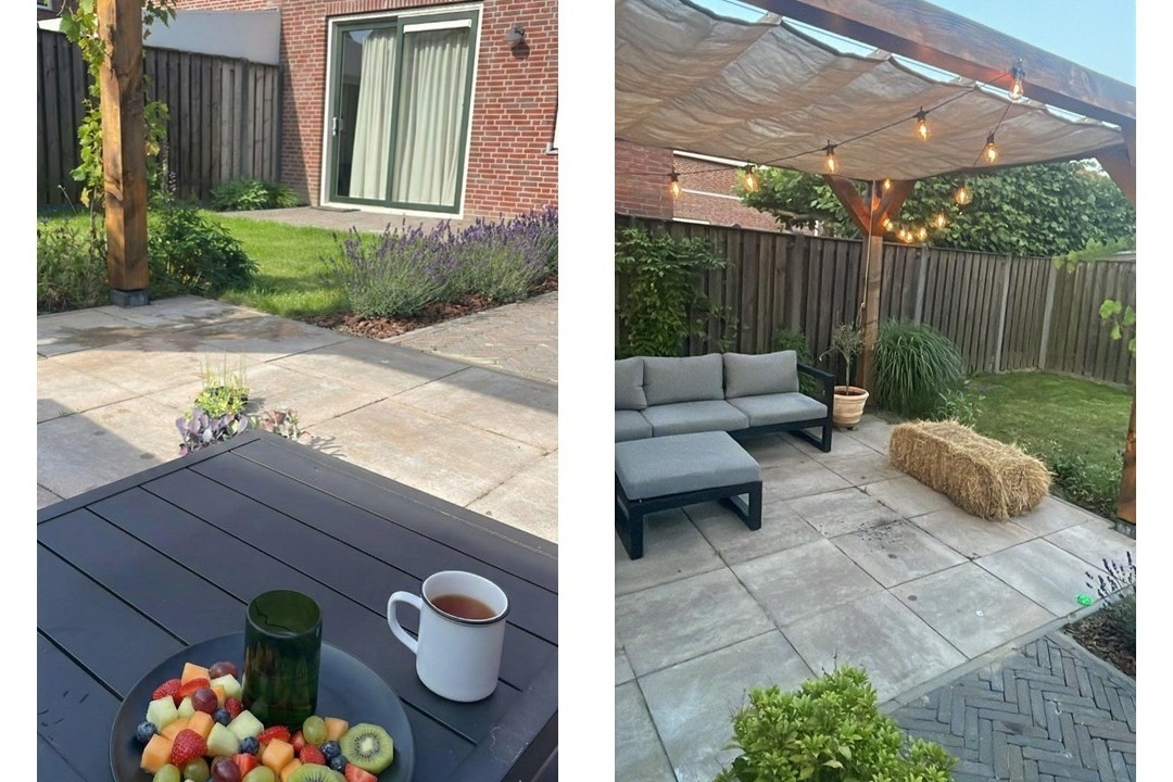 De achtertuin is verzorgd en sfeervol ingericht. Een fijne plek om buiten te zitten, met een overkapping met doek voor schaduw op warme dagen. Tevens bevindt zich in de tuin een houten berging. Ook is er een praktische containerhoek met extra bergruimte. Via de poort aan de zijkant zijn de oprit en de tuin goed bereikbaar.