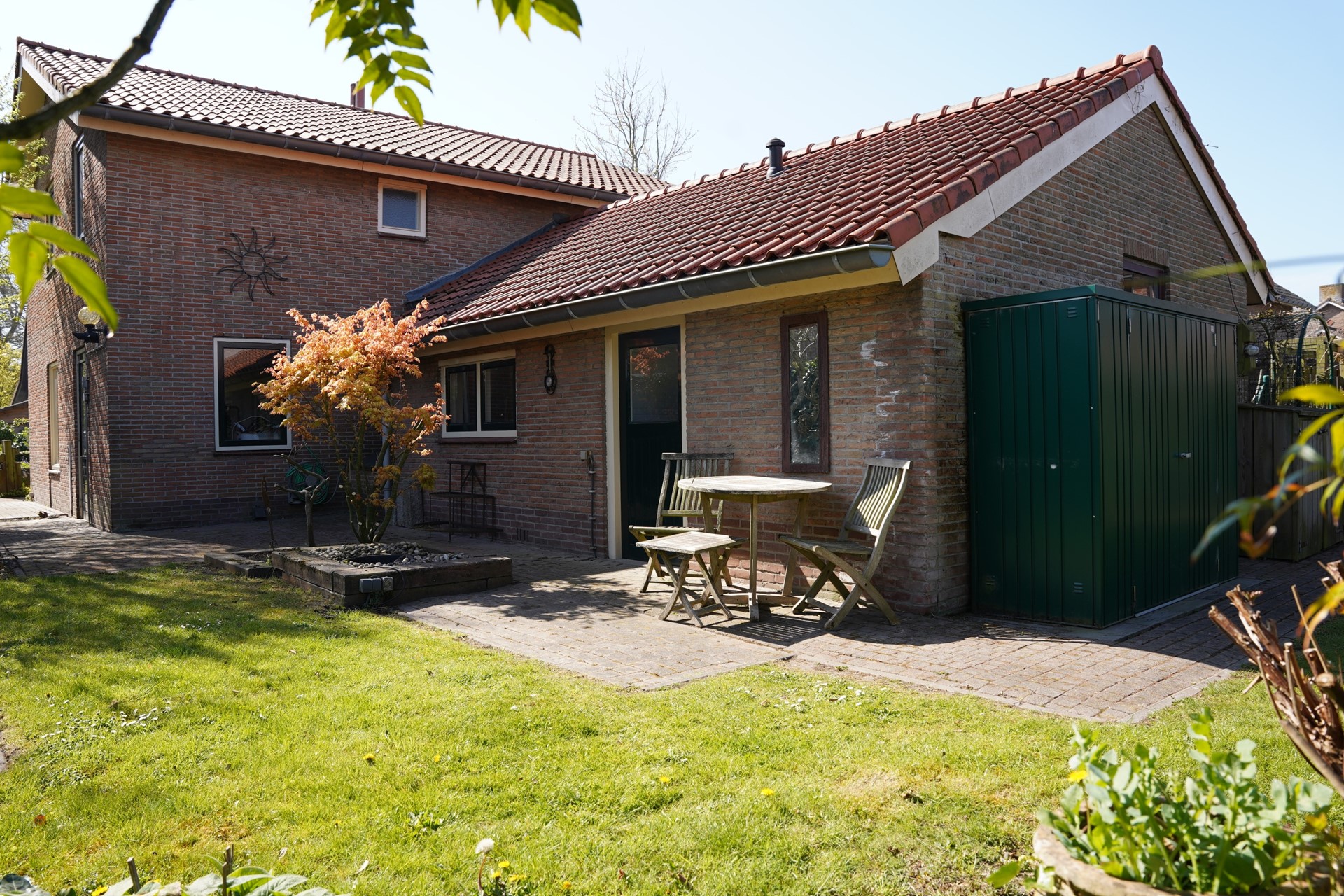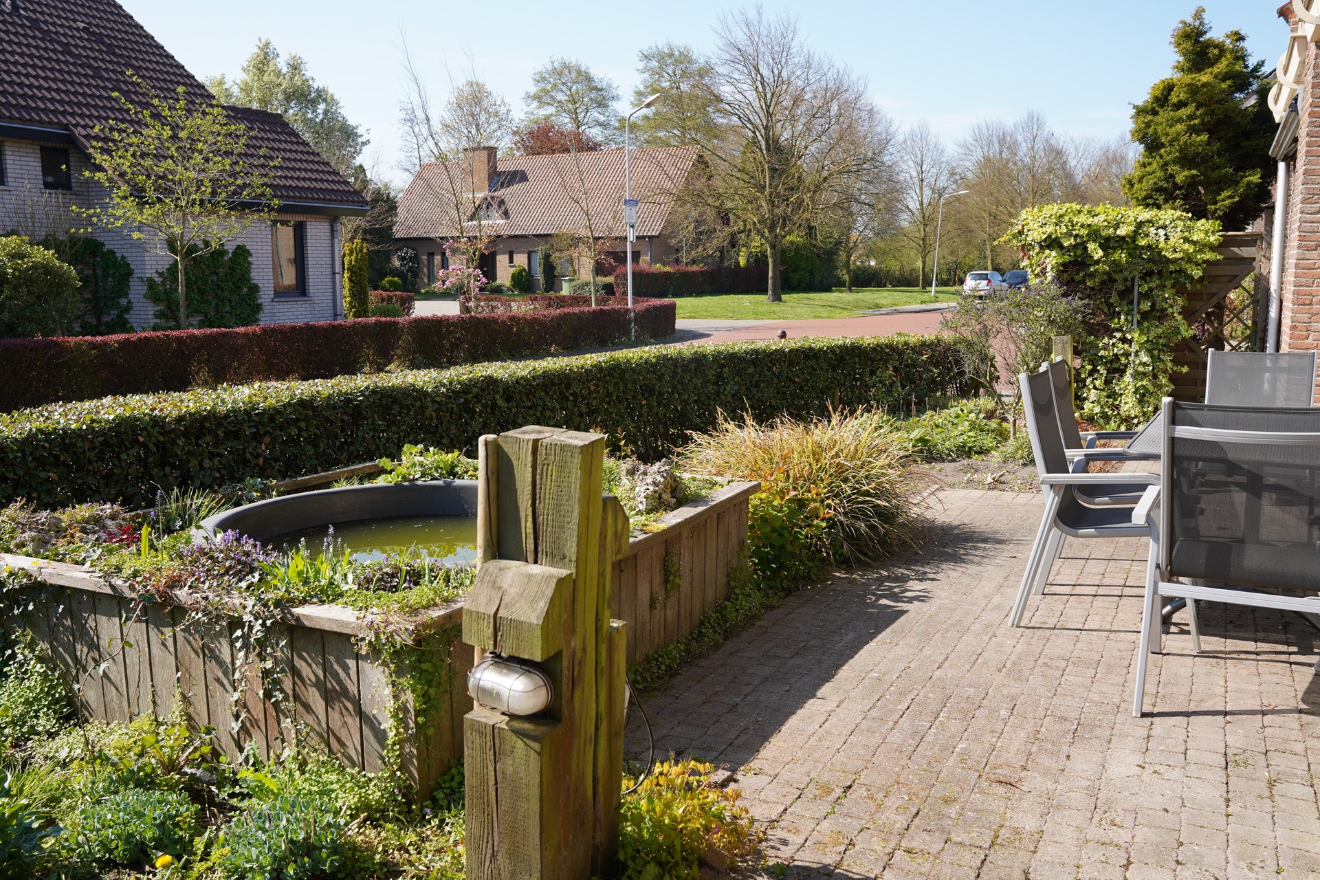 De tuin rondom het huis is een echt buitenparadijs. Er zijn meerdere terrassen, gezellige zitjes en veel groen. Aan de voorzijde wacht een zonnig terras op het zuiden, compleet met zonnescherm en een sfeervolle vijverpartij. Je kijkt vanaf hier uit op het groen en in de verte het natuurgebied 't Groote Gat. Rust en ruimte in overvloed dus.