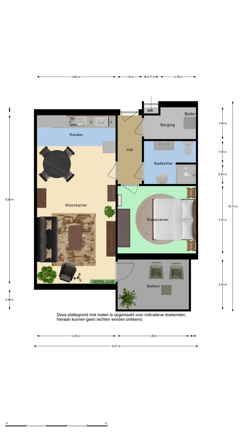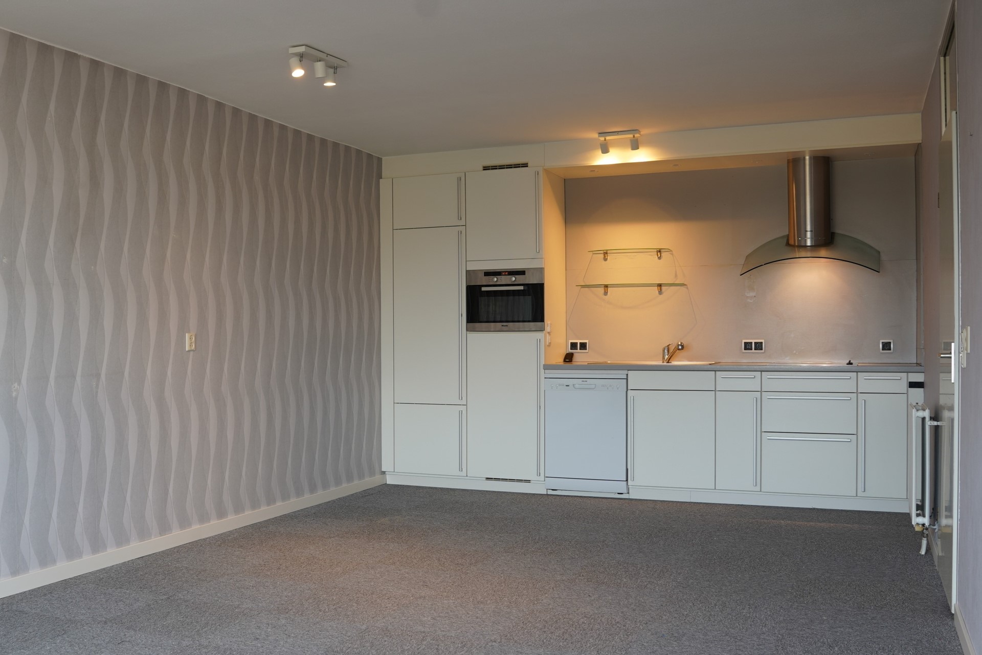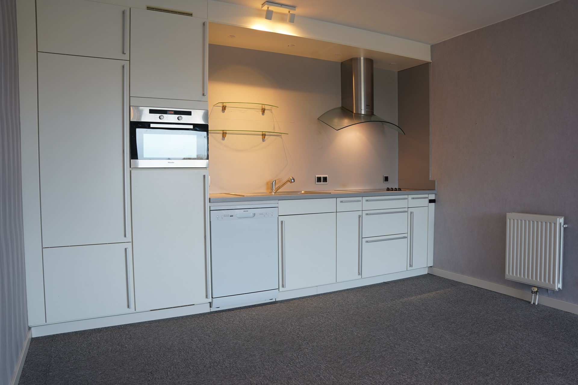 Via de centrale hal bereik je het appartement met zowel de lift als de trap. De entree geeft toegang tot alle vertrekken: woonkamer, slaapkamer, badkamer en berging. De ruime, lichte woonkamer is het hart van de woning en biedt directe toegang tot het balkon – perfect om ’s ochtends van de zon te genieten. De open keuken is modern en uitgerust met diverse inbouwapparatuur: keramische kookplaat met afzuigkap, oven, koelkast en vaatwasser. Verder beschikt het appartement over een comfortabele slaapkamer en een complete badkamer met douche, wastafel en een toilet. Een praktische berging met de aansluiting voor een wasmachine maakt het geheel compleet.