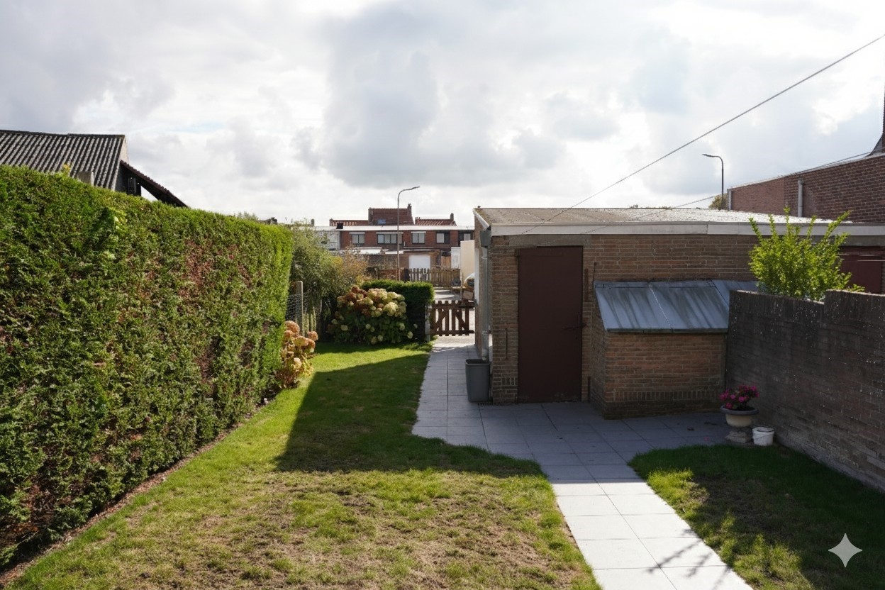 Gelegen op het zuiden, met een terras, een gazon en een uitgang aan de achterzijde. Je vindt hier je eigen garage, voorzien van een elektrische roldeur. Voor de garage is er nog plaats om je tweede auto te parkeren.
