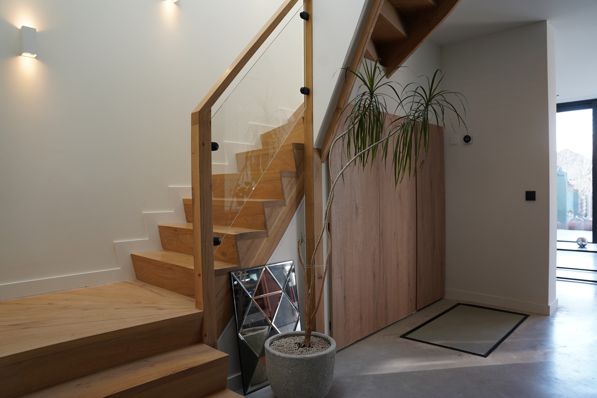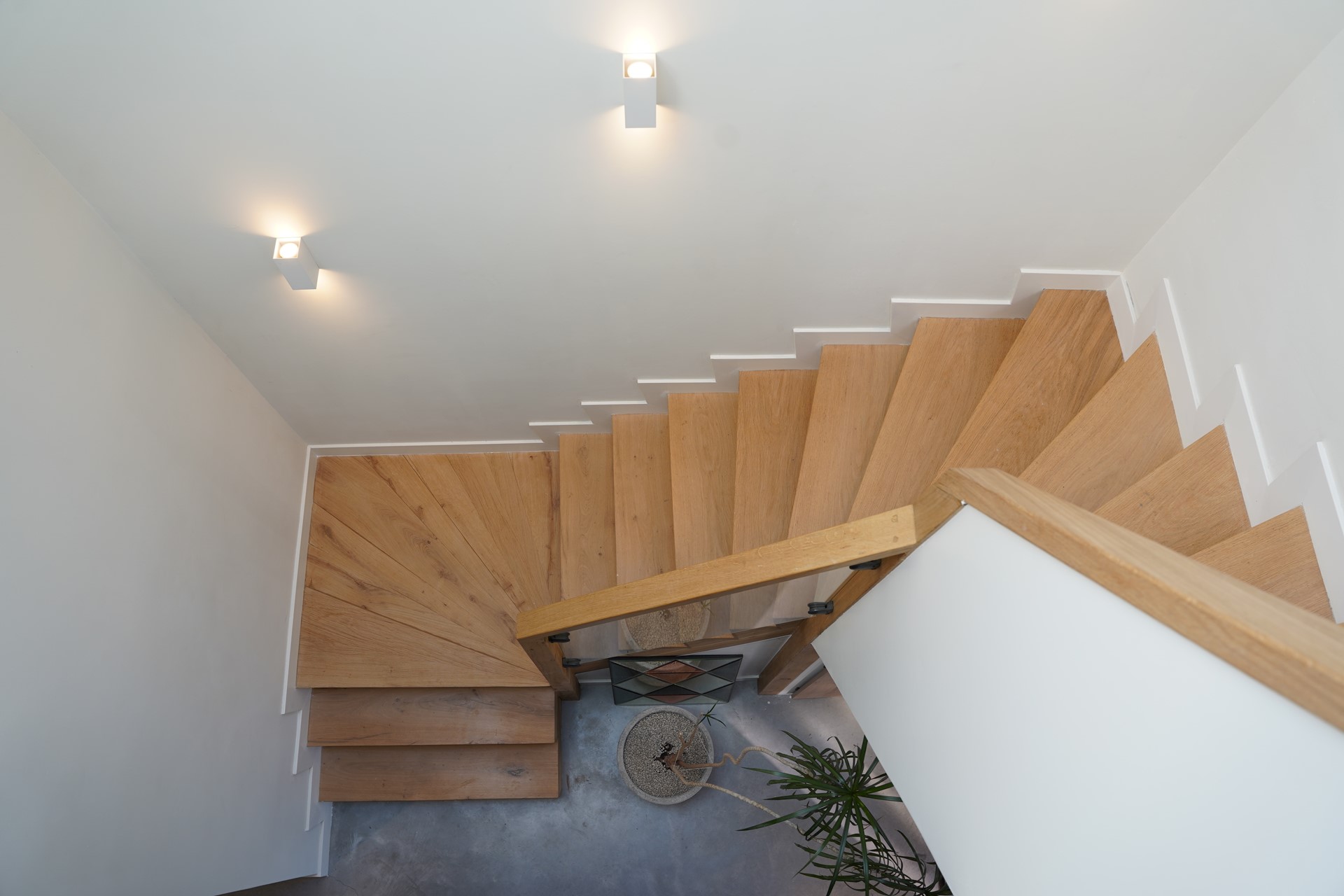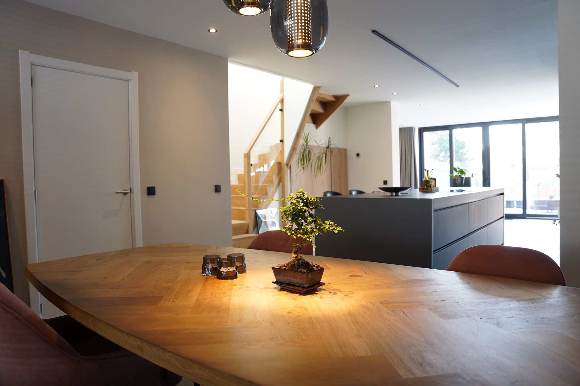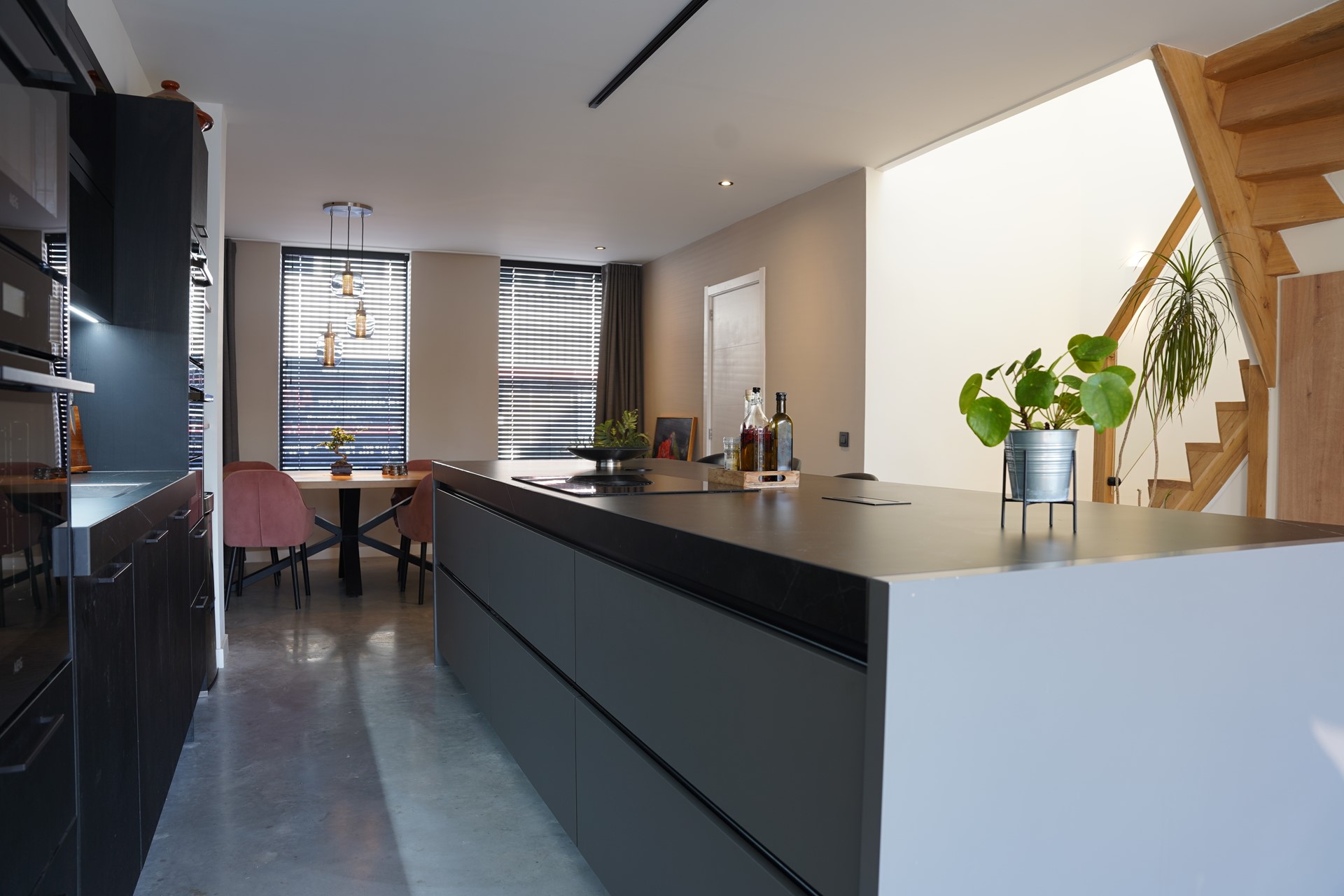 De hal, met meterkast, is strak en modern en geeft toegang tot het hangtoilet en de royale woonruimte. De open woonruimte is licht en ruim, met in het midden een luxe eilandkeuken als blikvanger in het hart van het huis. De keuken is compleet uitgerust met hoogwaardige apparatuur en vormt het natuurlijke middelpunt van het huis. Je zult verrast zijn over de hoeveelheid apparatuur die in deze keuken is ingebouwd; een chef-kok zou jaloers worden! De uitbouw aan de achterzijde zorgt voor een heerlijke zithoek met dubbele schuifpuien naar de tuin. Onder de trap vind je maatwerk kasten met de verdeler van de verwarming en de boiler. Ook is er een extra aansluiting voor een 2e wasmachine of een droger. Hier is tevens de kelder met een elektrisch bedienbare toegang. Dankzij de vloerverwarming gecombineerd met de goede isolatie voelt het in de hele leefruimte altijd comfortabel aan. De betonvloer en strakke afwerking geven een eigentijdse uitstraling. Het hart van het huis heeft een verrassender lichtinval via de slim geplaatste dakramen boven de werkelijk schitterende houten opgaande trap.