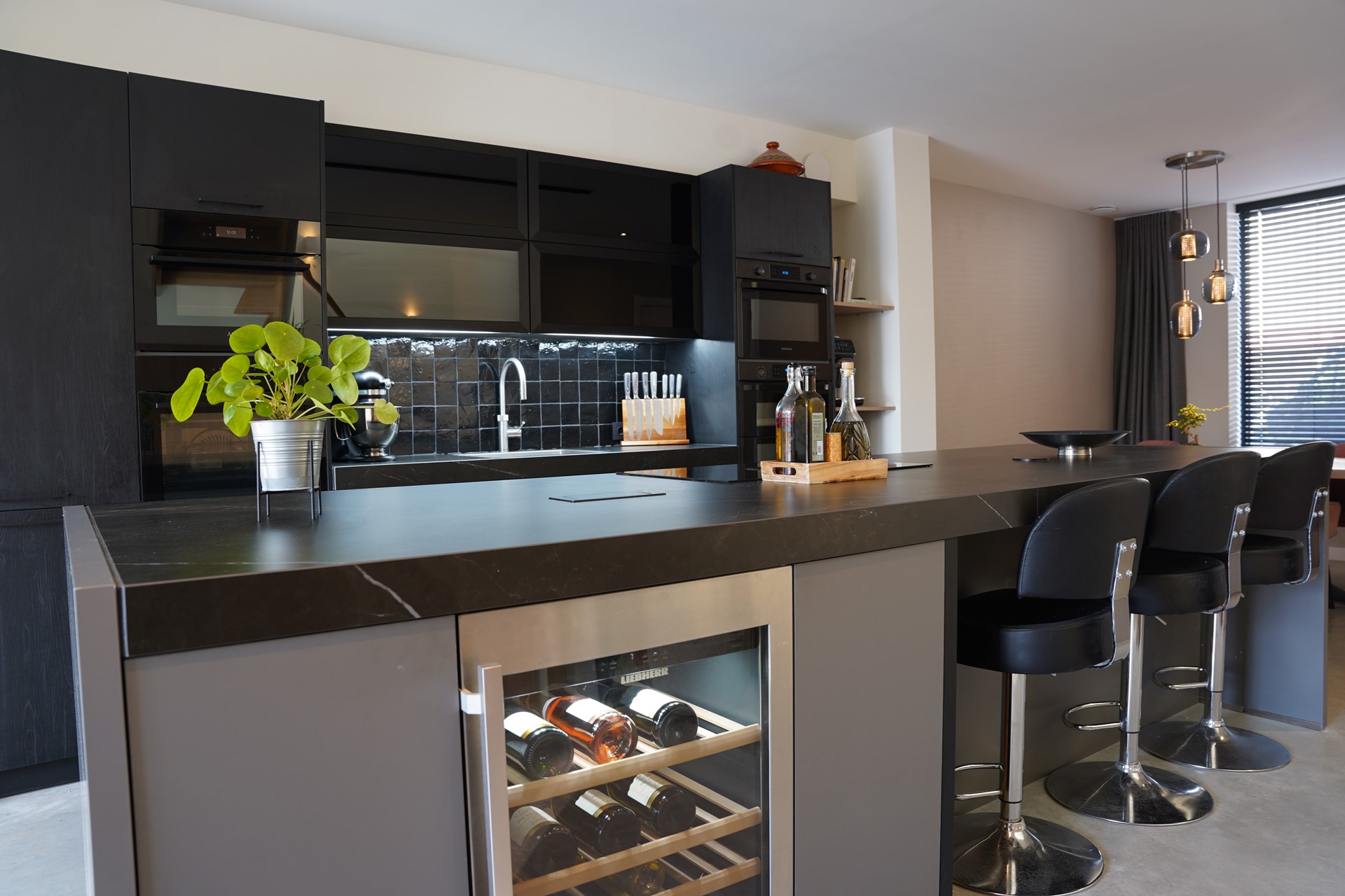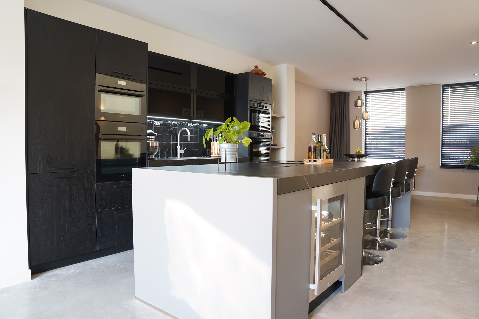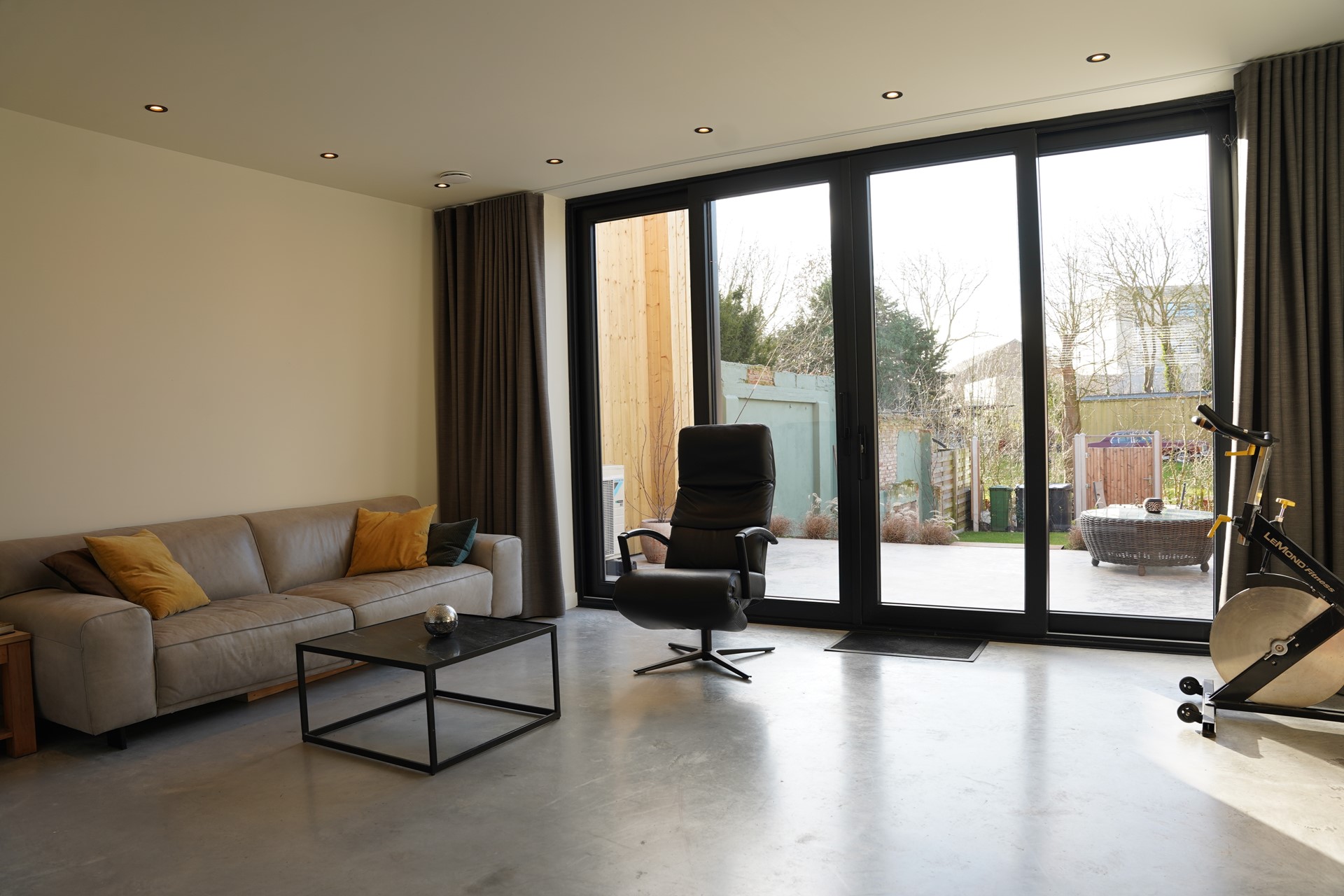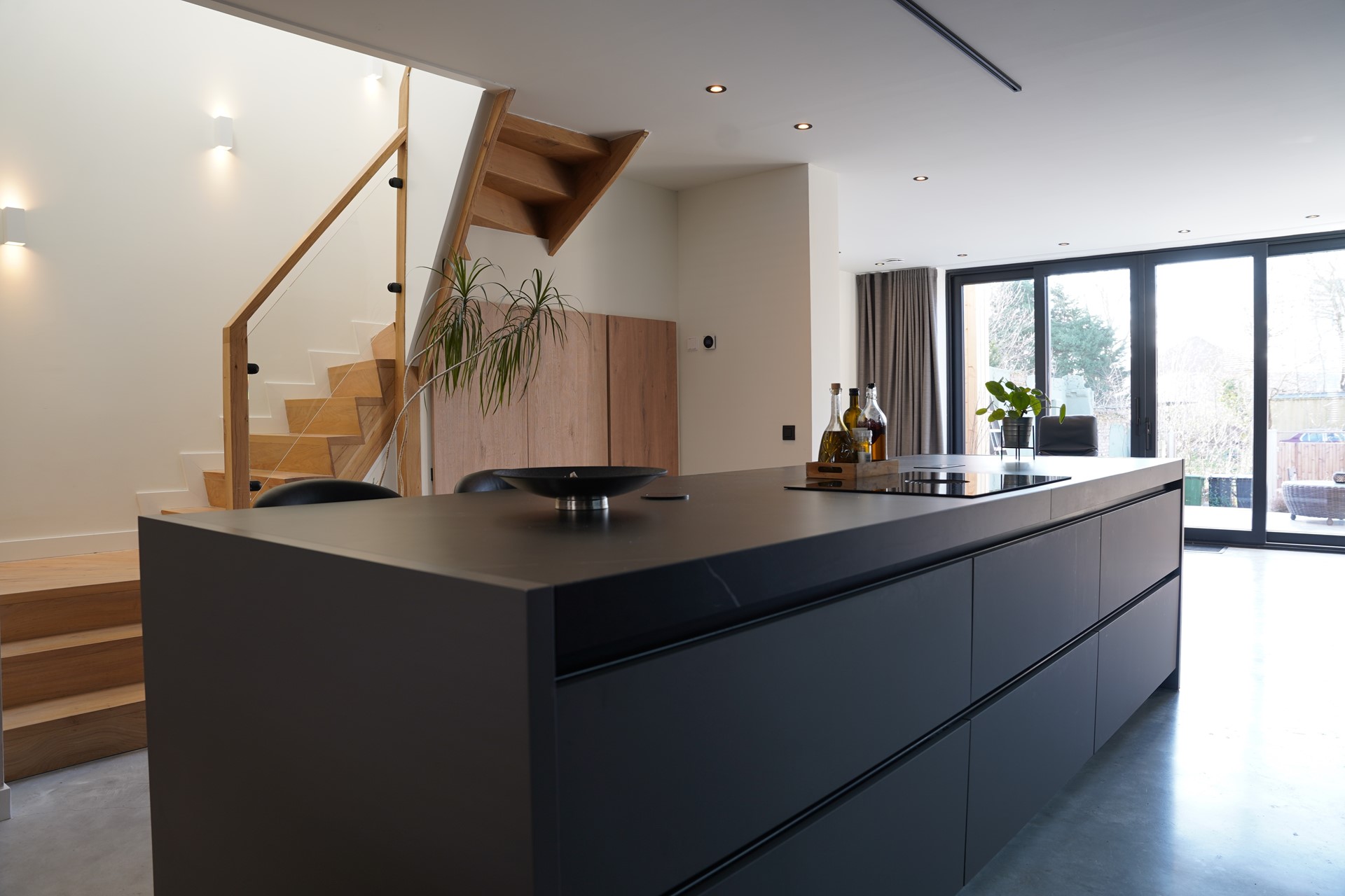 De hal, met meterkast, is strak en modern en geeft toegang tot het hangtoilet en de royale woonruimte. De open woonruimte is licht en ruim, met in het midden een luxe eilandkeuken als blikvanger in het hart van het huis. De keuken is compleet uitgerust met hoogwaardige apparatuur en vormt het natuurlijke middelpunt van het huis. Je zult verrast zijn over de hoeveelheid apparatuur die in deze keuken is ingebouwd; een chef-kok zou jaloers worden! De uitbouw aan de achterzijde zorgt voor een heerlijke zithoek met dubbele schuifpuien naar de tuin. Onder de trap vind je maatwerk kasten met de verdeler van de verwarming en de boiler. Ook is er een extra aansluiting voor een 2e wasmachine of een droger. Hier is tevens de kelder met een elektrisch bedienbare toegang. Dankzij de vloerverwarming gecombineerd met de goede isolatie voelt het in de hele leefruimte altijd comfortabel aan. De betonvloer en strakke afwerking geven een eigentijdse uitstraling. Het hart van het huis heeft een verrassender lichtinval via de slim geplaatste dakramen boven de werkelijk schitterende houten opgaande trap.