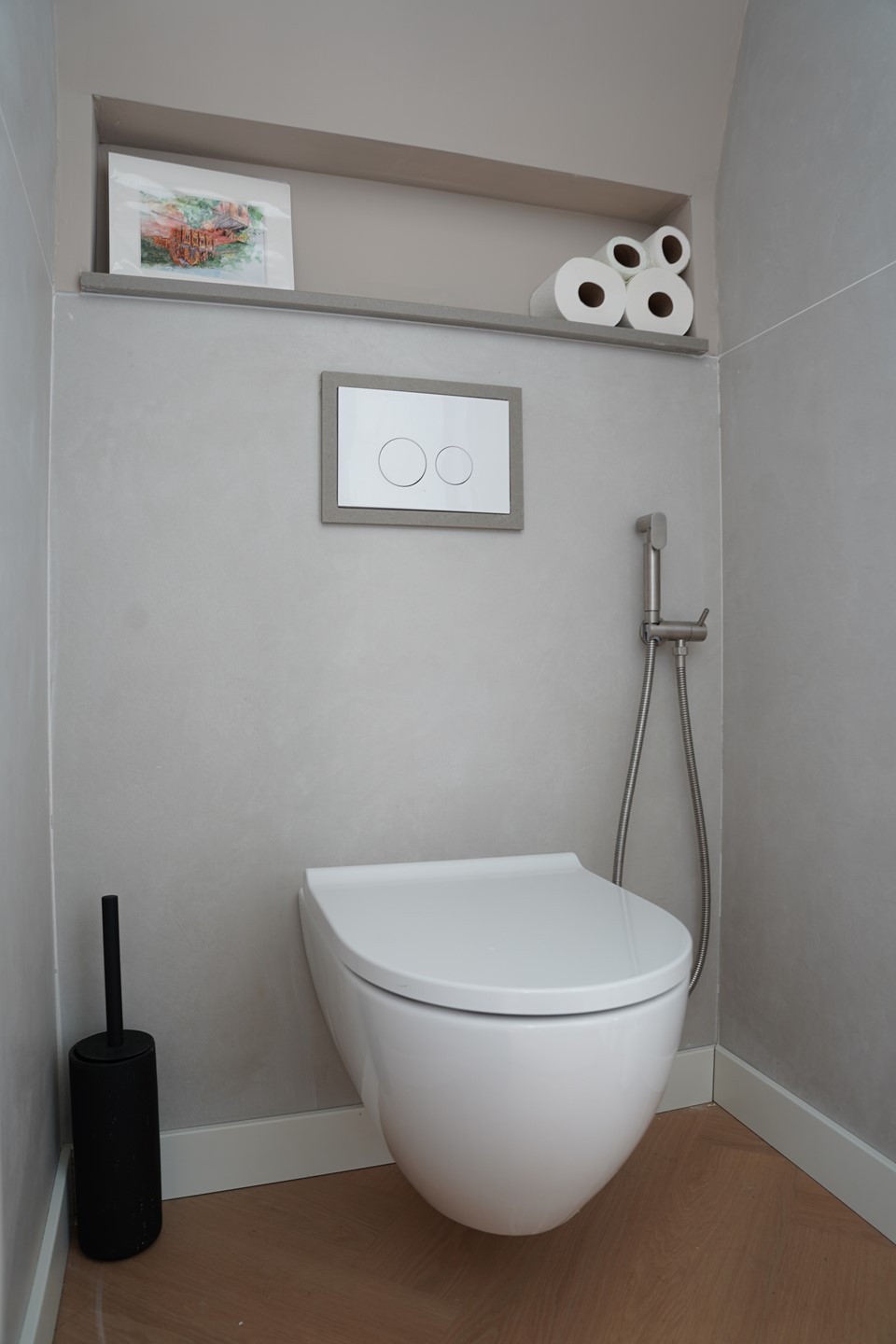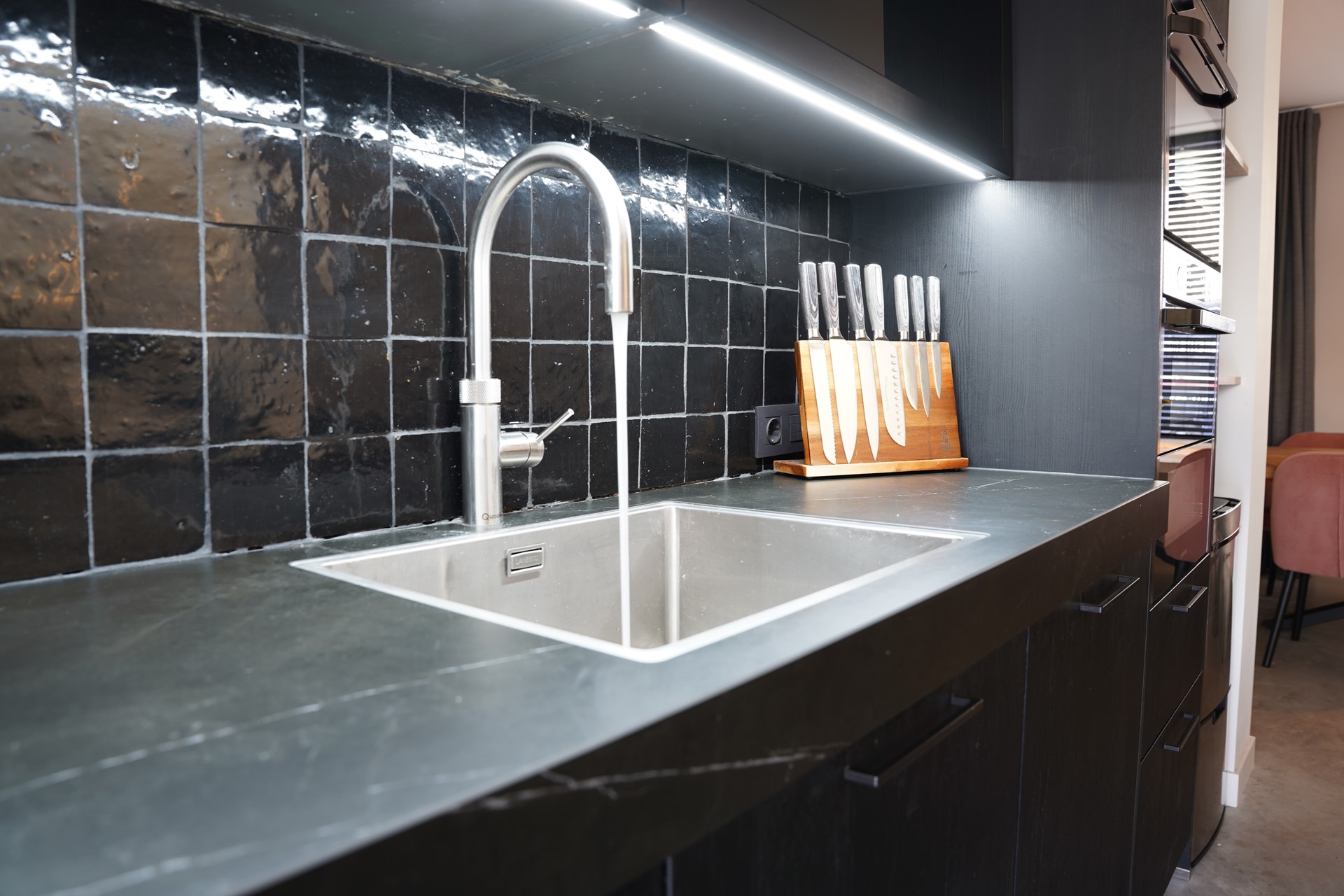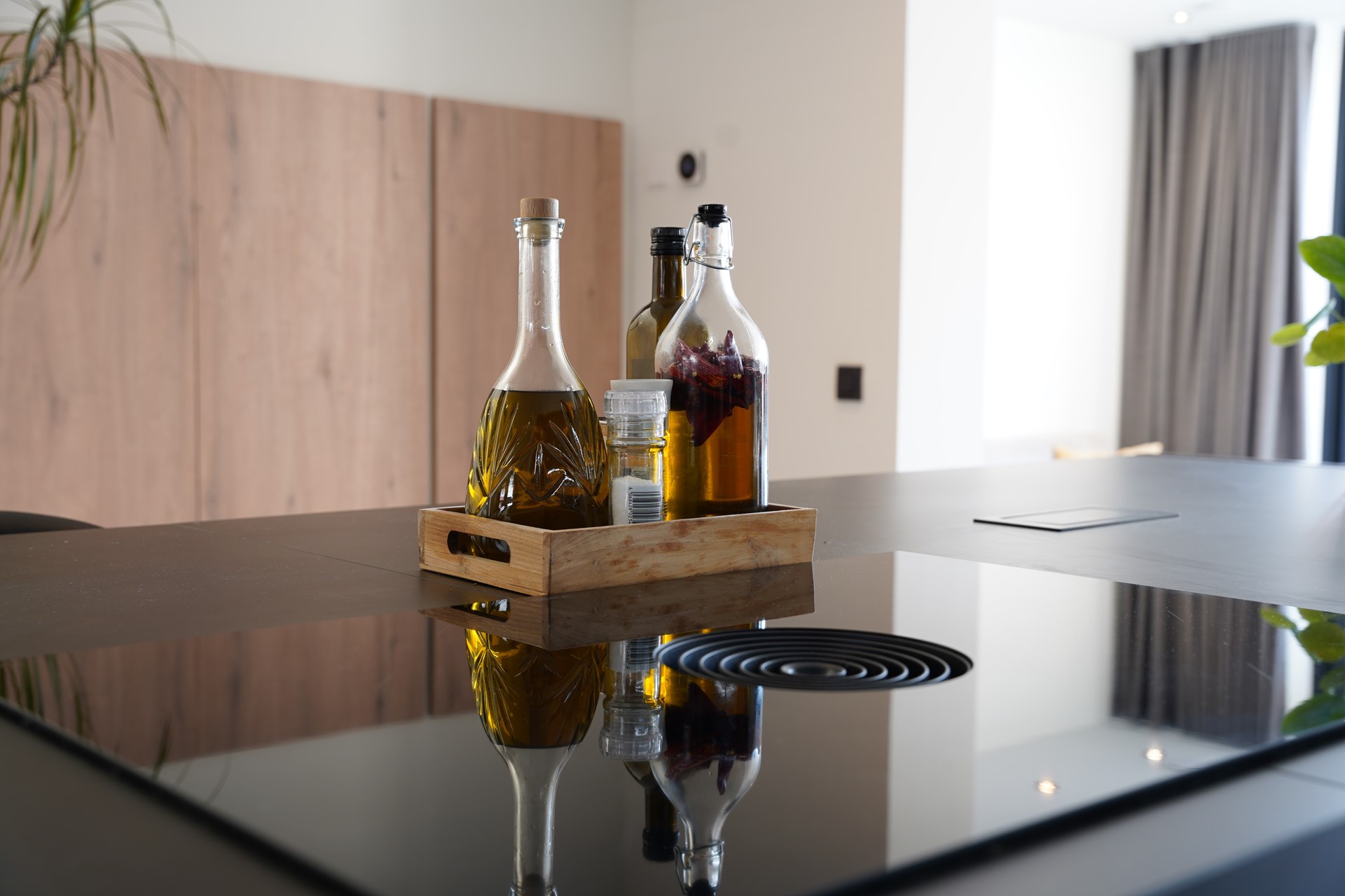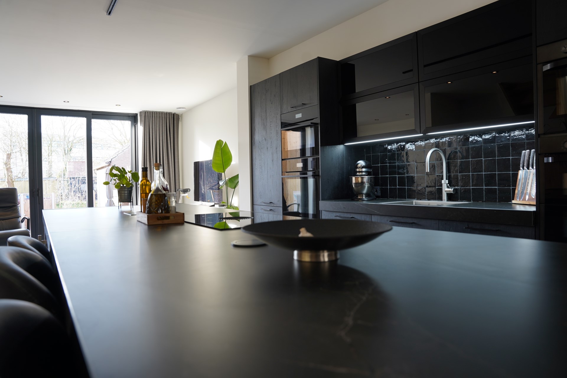 De hal, met meterkast, is strak en modern en geeft toegang tot het hangtoilet en de royale woonruimte. De open woonruimte is licht en ruim, met in het midden een luxe eilandkeuken als blikvanger in het hart van het huis. De keuken is compleet uitgerust met hoogwaardige apparatuur en vormt het natuurlijke middelpunt van het huis. Je zult verrast zijn over de hoeveelheid apparatuur die in deze keuken is ingebouwd; een chef-kok zou jaloers worden! De uitbouw aan de achterzijde zorgt voor een heerlijke zithoek met dubbele schuifpuien naar de tuin. Onder de trap vind je maatwerk kasten met de verdeler van de verwarming en de boiler. Ook is er een extra aansluiting voor een 2e wasmachine of een droger. Hier is tevens de kelder met een elektrisch bedienbare toegang. Dankzij de vloerverwarming gecombineerd met de goede isolatie voelt het in de hele leefruimte altijd comfortabel aan. De betonvloer en strakke afwerking geven een eigentijdse uitstraling. Het hart van het huis heeft een verrassender lichtinval via de slim geplaatste dakramen boven de werkelijk schitterende houten opgaande trap.