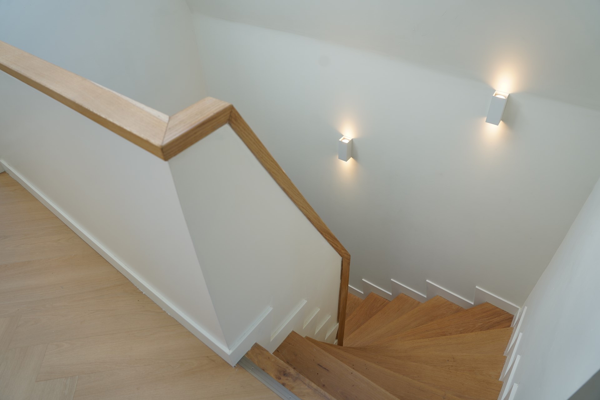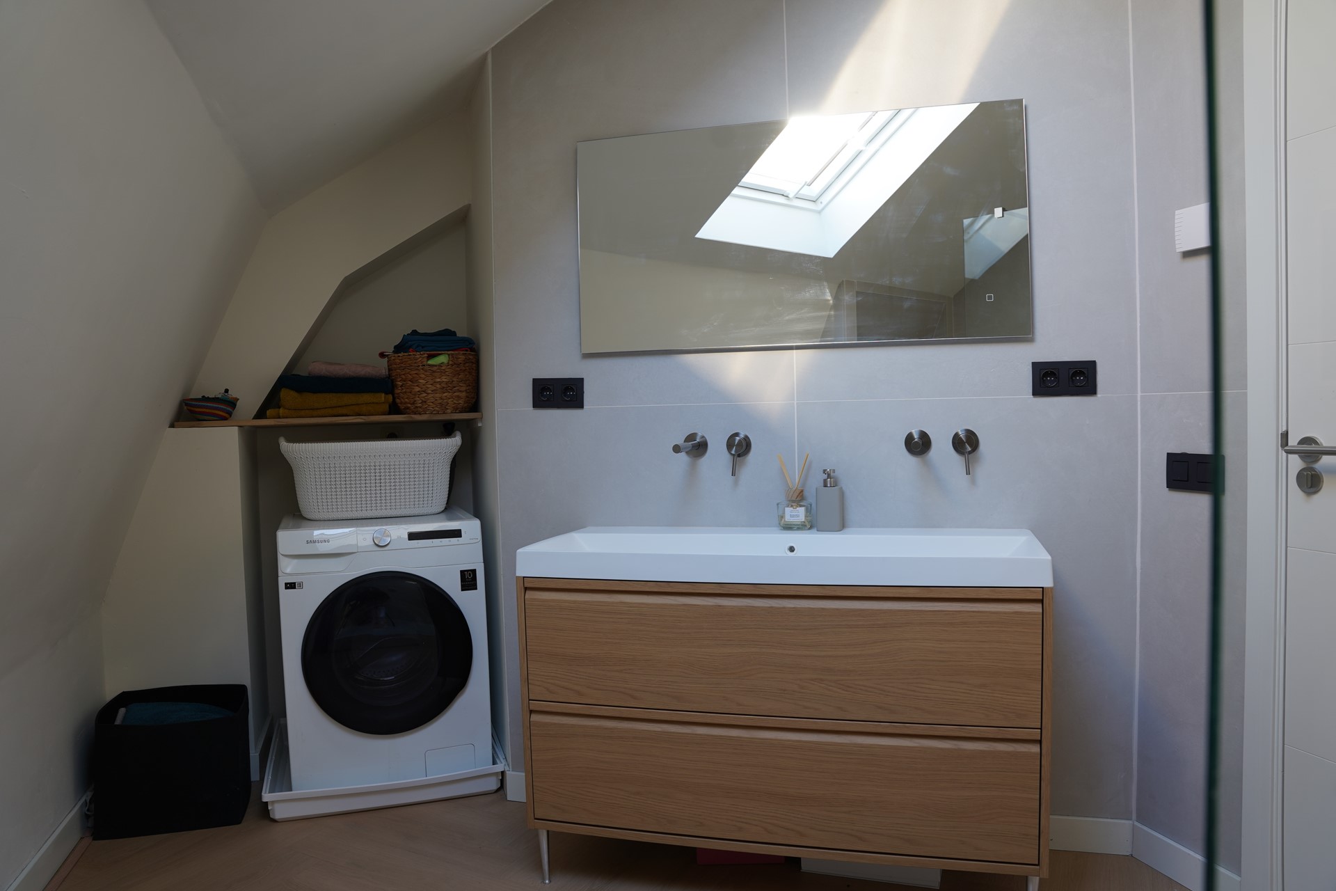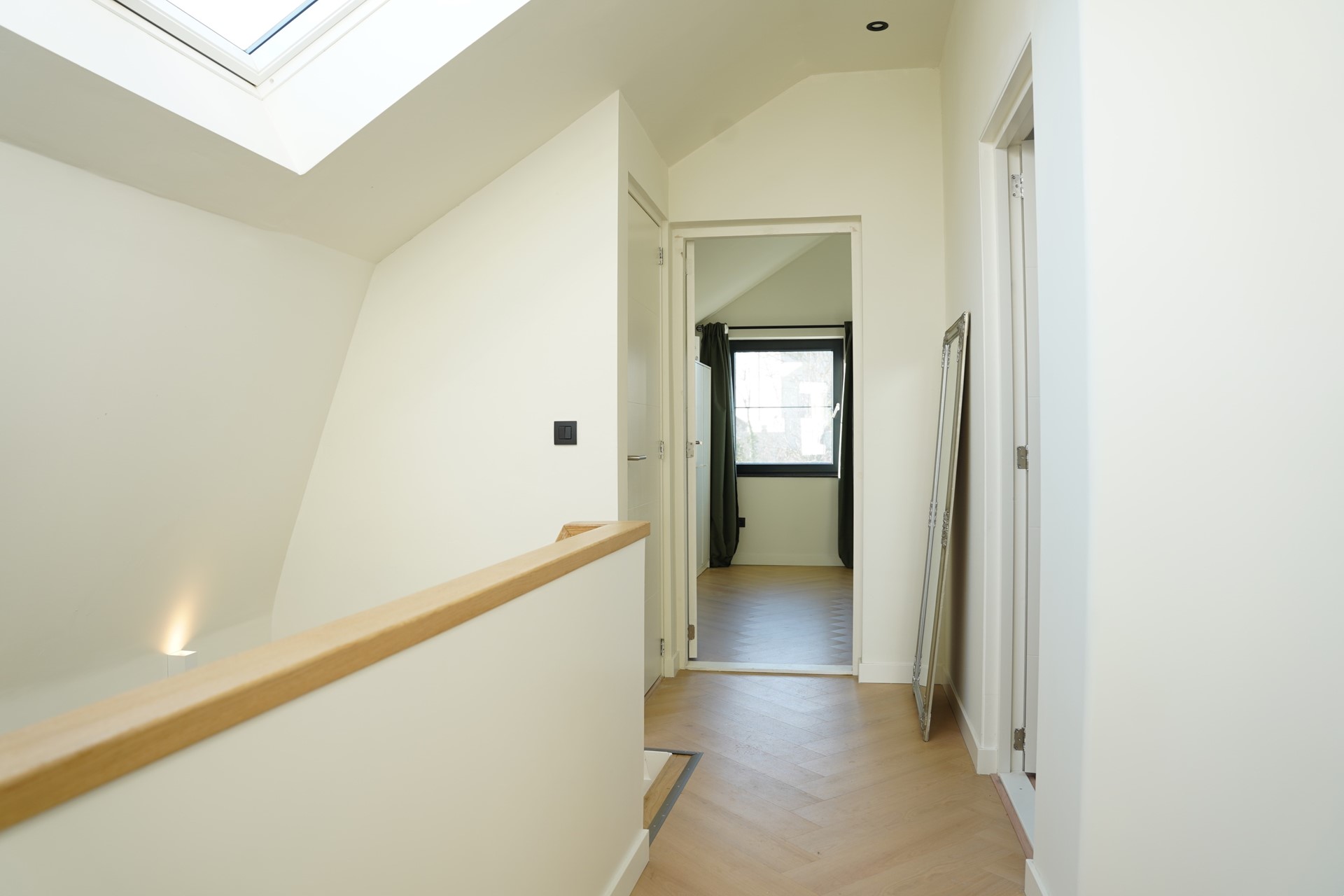 Via de stijlvolle trap kom je op de verdieping met visgraat pvc en overloop met prachtig daglicht dankzij drie Velux dakramen. Er zijn drie slaapkamers, waaronder een royale masterbedroom met vaste kasten. De badkamer is luxe en compleet uitgevoerd met een inloop- regendouche, dubbel wastafelmeubel, verwarmde spiegel en een Velux dakraam. Ook is hier een wasmachine aansluiting te vinden. Verder is er op de overloop een separaat toilet.