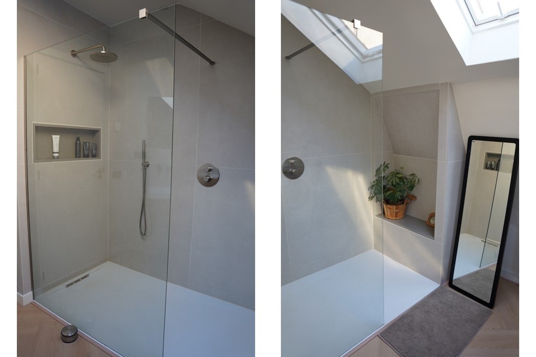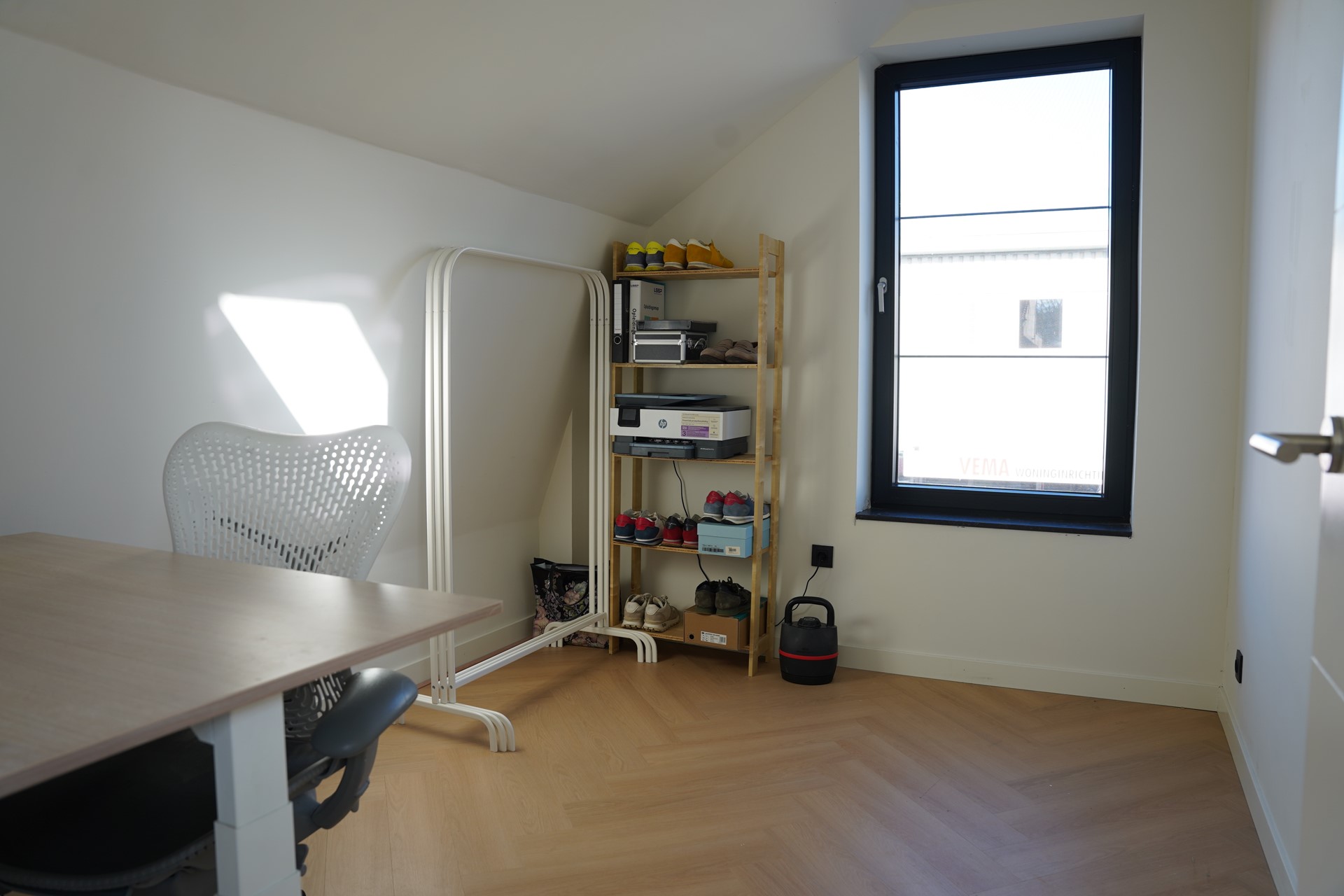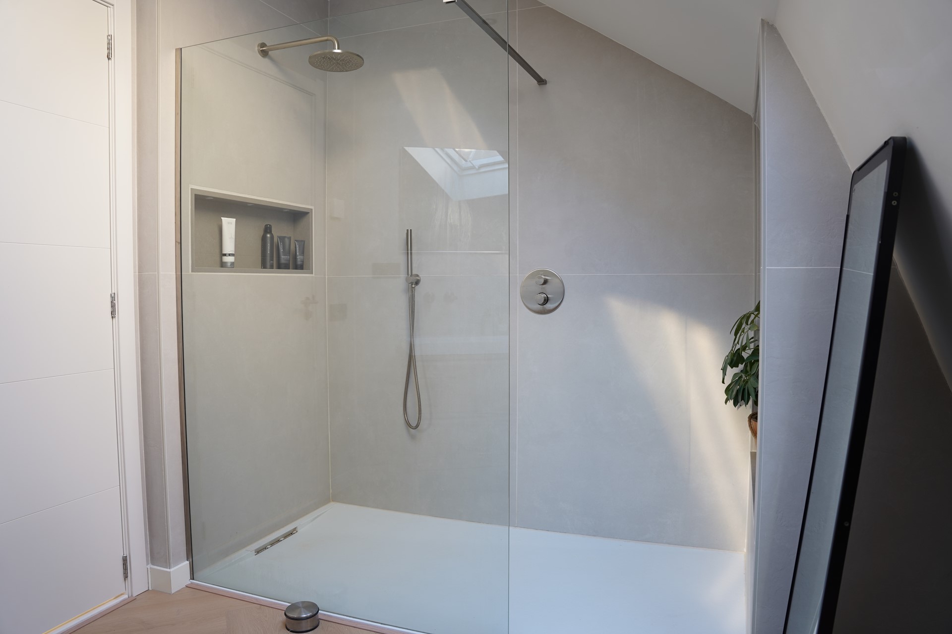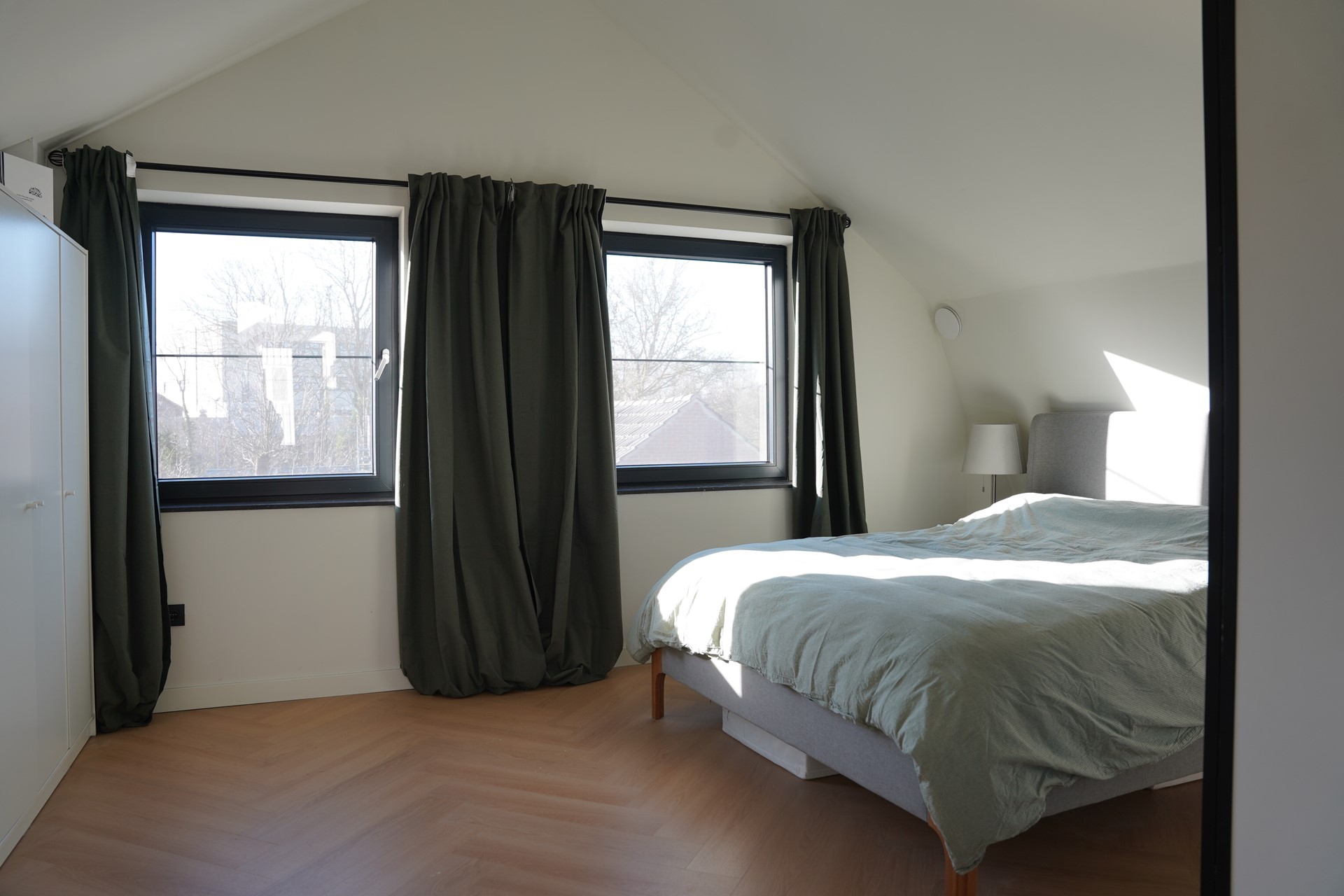 Via de stijlvolle trap kom je op de verdieping met visgraat pvc en overloop met prachtig daglicht dankzij drie Velux dakramen. Er zijn drie slaapkamers, waaronder een royale masterbedroom met vaste kasten. De badkamer is luxe en compleet uitgevoerd met een inloop- regendouche, dubbel wastafelmeubel, verwarmde spiegel en een Velux dakraam. Ook is hier een wasmachine aansluiting te vinden. Verder is er op de overloop een separaat toilet.