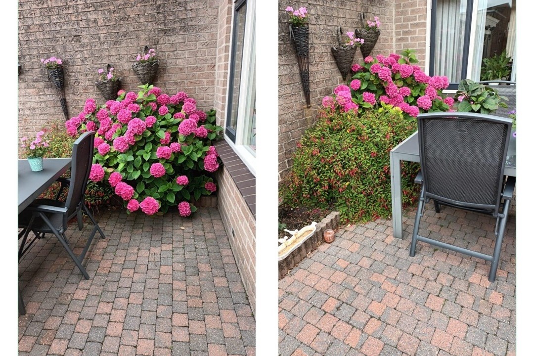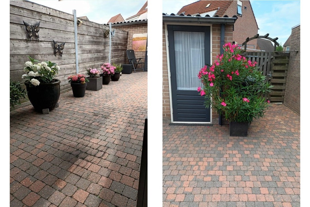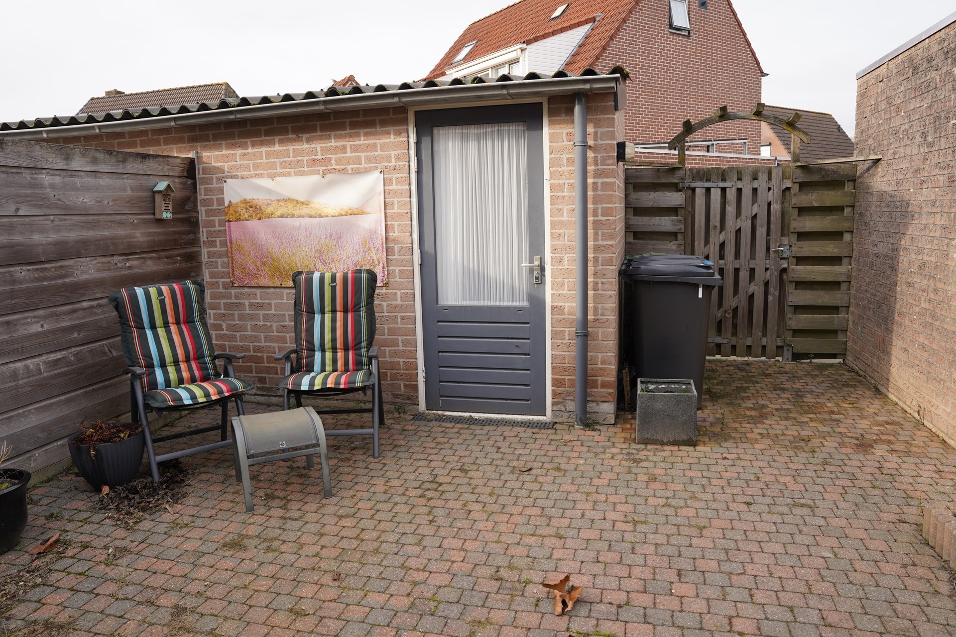 De achtertuin is onderhoudsvrij aangelegd en volledig bestraat. Hier geniet je van een zonnig terras en dankzij de achterom is de tuin ook praktisch bereikbaar. Het elektrische zonnescherm zorgt op warme dagen voor extra comfort. Achterin de tuin staat een vrijstaande stenen berging, ideaal voor fietsen en opslag.