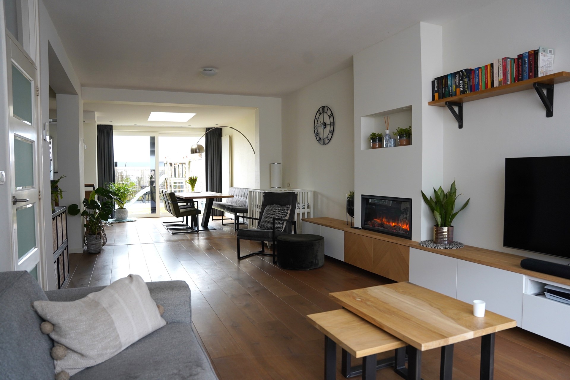Via de verzorgde voortuin kom je binnen in de hal met toilet en vernieuwde meterkast. Hier voel je meteen de nette afwerking die in de hele woning terugkomt. De woonkamer is ruim en sfeervol met brede houten vloerdelen en een moderne schouw die een gezellig middelpunt vormt in de ruimte. Door de uitbouw aan de achterzijde is een prachtige open leefruimte ontstaan. Het daglicht valt rijkelijk naar binnen en de grote schuifpui zorgt voor een directe verbinding met de tuin. De woonkeuken vormt samen met de eetruimte een gezellige plek, die voorzien is van een kookeiland en diverse moderne inbouwapparatuur, waaronder een Quooker. De afzuiging is zelfs met een afstandsbediening te bedienen. Aansluitend bevindt zich de praktische bijkeuken met aansluitingen voor wasmachine en droger en extra werkruimte. Vanuit de woning is de inpandige garage bereikbaar met sectionaaldeur.