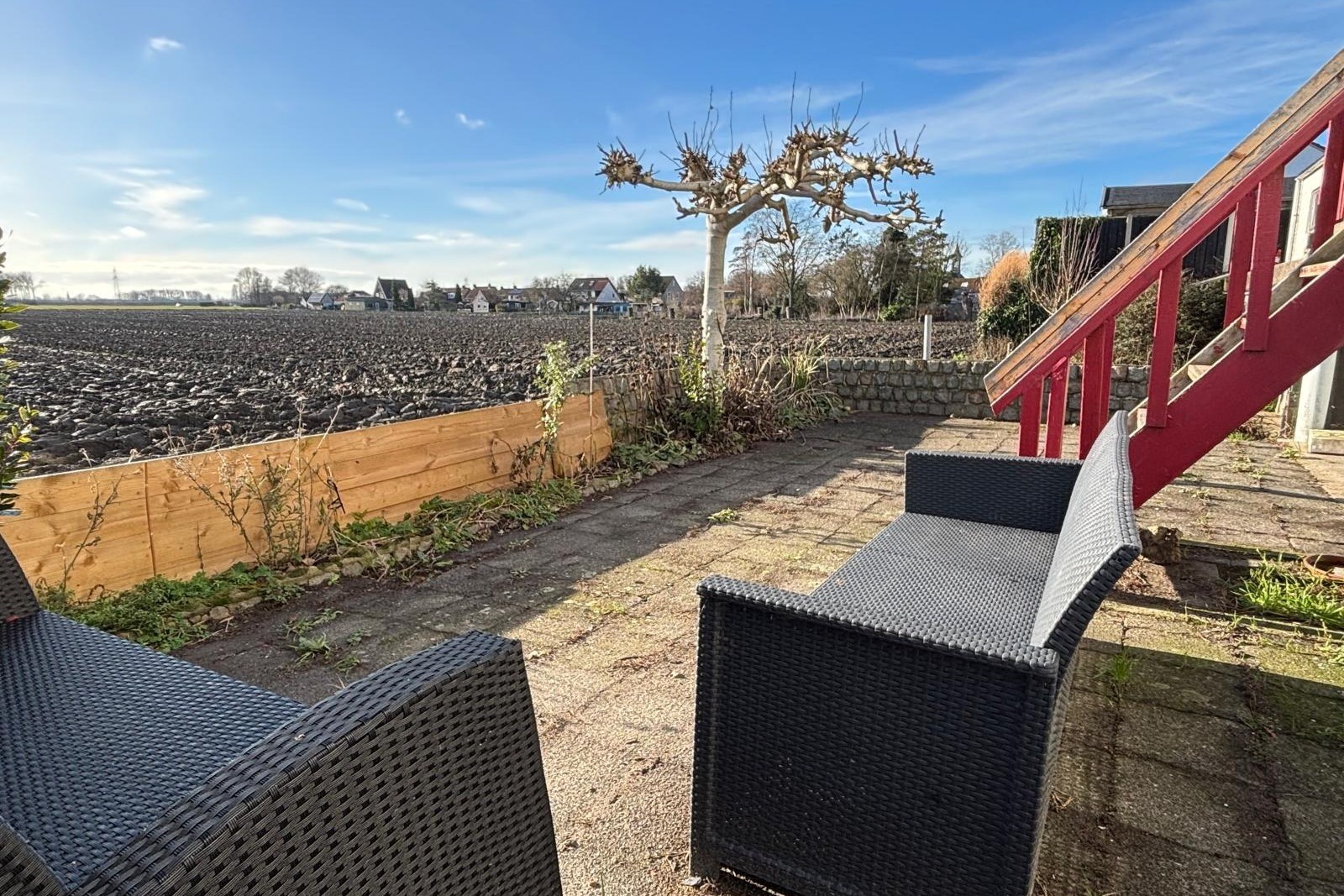 De tuin is echt een pluspunt. Met zowel een zuidelijke als westelijke ligging geniet je hier de hele dag van zon en licht. Het hoogteverschil in de tuin en het verlaagde terras geven het buitenleven extra karakter. Achter de woning ervaar je volledige vrijheid dankzij het open uitzicht over de akkers. Parkeren doe je gewoon op eigen terrein en de garage biedt extra bergruimte, maar kan ook – zoals nu – opgedeeld worden voor meerdere hobbyruimtes.