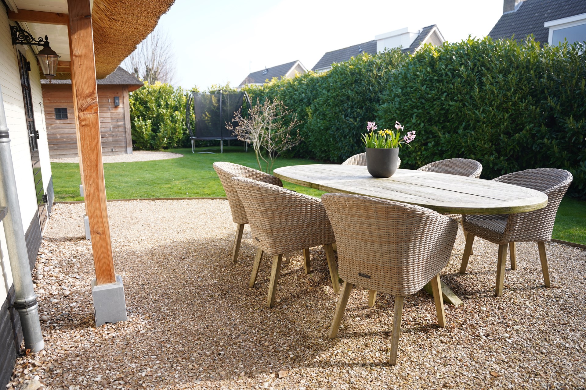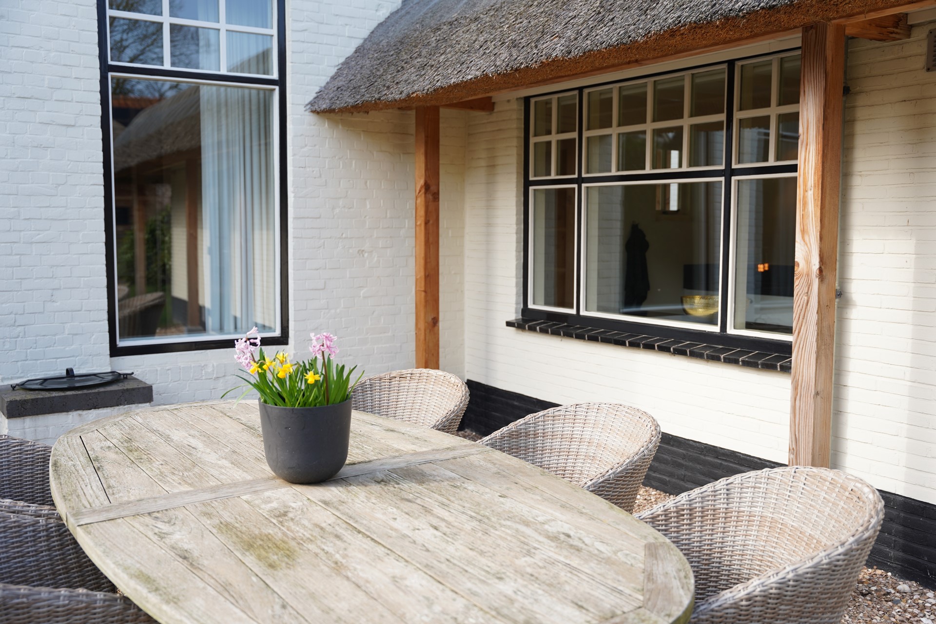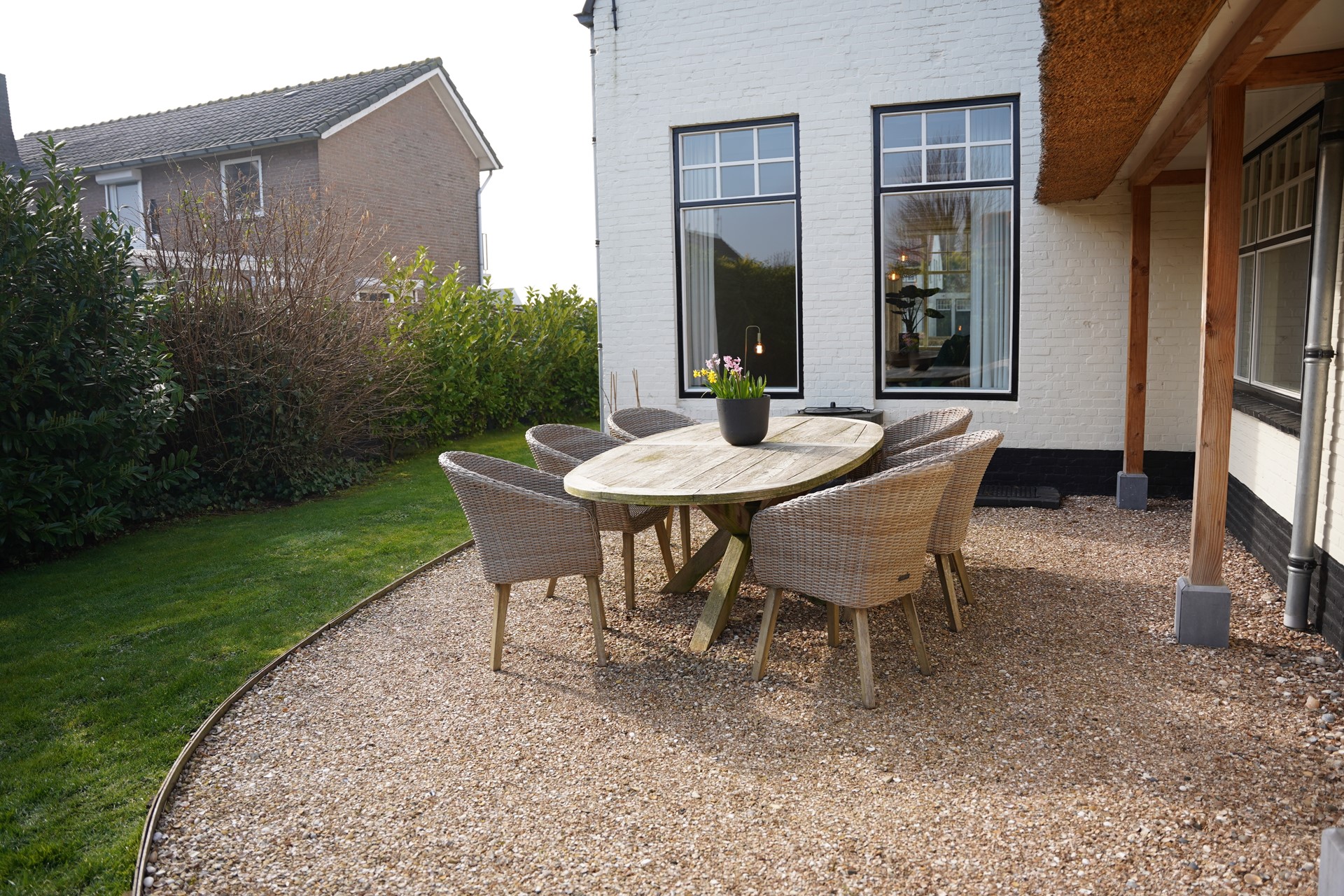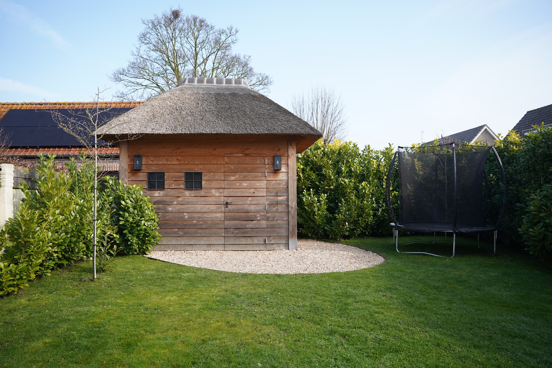 De tuin is onlangs opnieuw aangelegd en is een heerlijke plek om buiten te zijn. Hier kun je rustig genieten van het buitenleven. De aanbouw met het rieten afwerking geeft de woning een charmant en bijna landelijke uitstraling. In de tuin staat bovendien een mooie houten schuur met rieten kap uit 2022, voorzien van elektra. Parkeren kan gewoon op eigen terrein voor het huis. Achter op het perceel is zelfs nog ruimte om extra parkeergelegenheid op eigen grond te creëren.